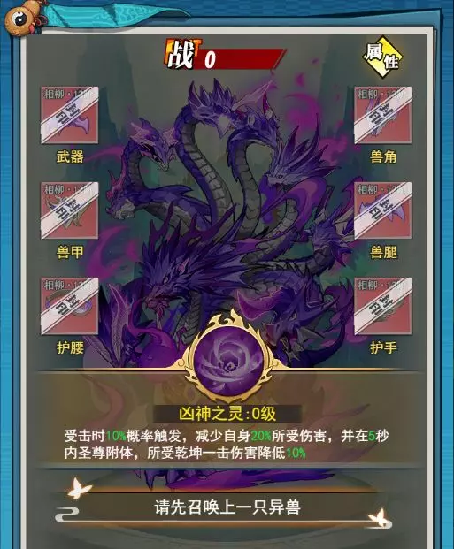 技能:凶神之灵:受到攻击时10%概率触发,减少自身受到20%的伤害,并在5秒内圣尊附体,所受乾坤一击的伤害降低10%