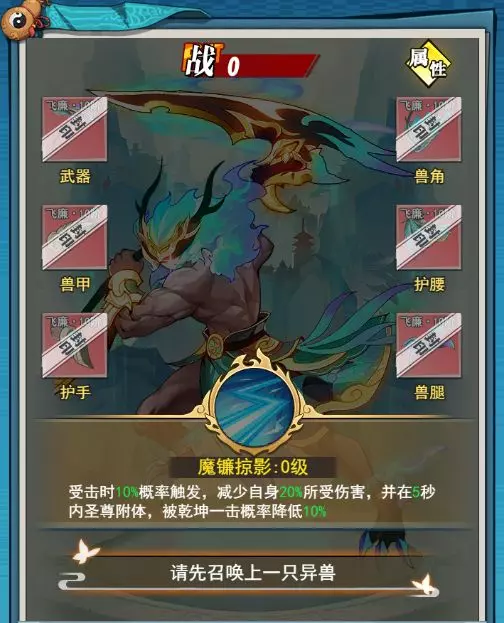 技能:魔镰掠影:受到攻击时10%概率触发,减少自身受到20%的伤害,并在5秒内圣尊附体,被乾坤一击的概率降低10%