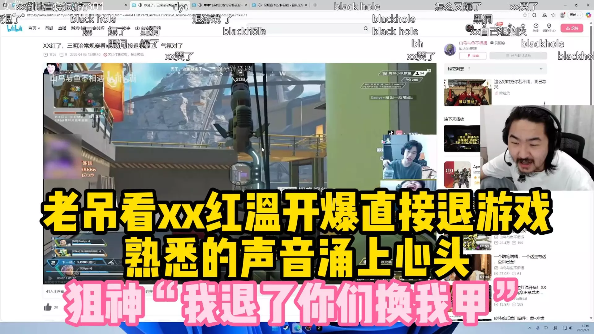这是B站主播老吊的《Apex英雄》直播精彩片段,展示了玩家QQ操控恶灵在ewc对局中极限兜底1v3,用赫姆洛克突击步枪两炮双杀灭队DCG的精彩操作,让老吊直呼惊叹。