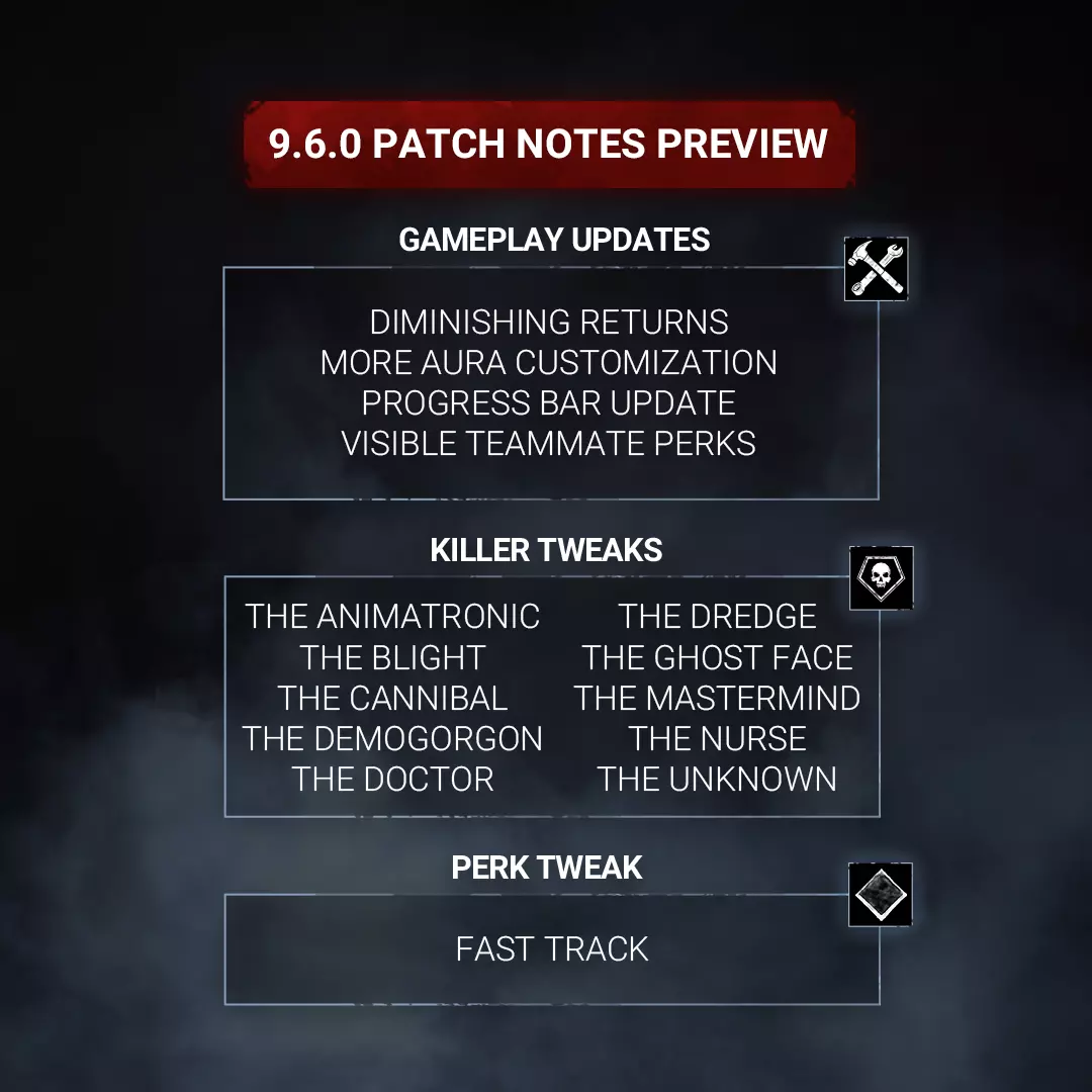 《黎明杀机》更新内容 1. 收益递减更新 在一场审判中,重复的正面或负面游戏玩法修正和状态效果现在会受到收益递减的影响。 由技能、物品、 perk 和祭品提供的相同修正,在叠加时将逐渐减少效果。 杀手技能和幸存者物品附加组件提供的修正【不包含】在收益递减范围内。 绝对值最高的游戏玩法修正将始终被应用,而数值较低的修正则会逐渐降低至其原始值的一定百分比。 游戏会优先考虑最高数值,降低较低数值的影响。第一个数值(最高)- 100%的修正值 第二个数值 - 50%的修正值 第三个数值 - 25%的修正值 第四个数值 - 12.5%的修正值 第五个及以上数值 - 5%的修正值 开发者说明:在《黎明杀机》运营10年后,杀手与逃生者无限叠加修正值的能力导致游戏节奏不断加快且愈发激烈。通过本次更新,我们旨在规范不同来源的修正值之间的相互作用,以更好地维护游戏的完整性。本次更新涵盖了两个阵营的所有主要游戏性修正值和状态效果。 此外,这一改动将帮助我们开发者利用现有的游戏修正值为角色设计新的有趣技能、物品和 perk,同时大幅降低出现意外破坏游戏平衡情况的风险。我们将在公共测试服期间密切关注这一改动,并期待各位的反馈!