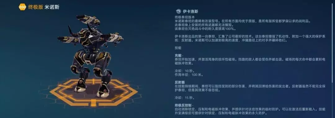 终极米诺斯作为伊卡洛斯出品的终极版泰坦,正以全面强化的技能循环与独特的电磁脉冲控制机制重塑战场格局。其核心技能【充能】冷却时间由15秒缩短至10秒,配合百米作用半径与隔墙命中特性,使这台机械巨兽具备了前所未有的战术威慑力。