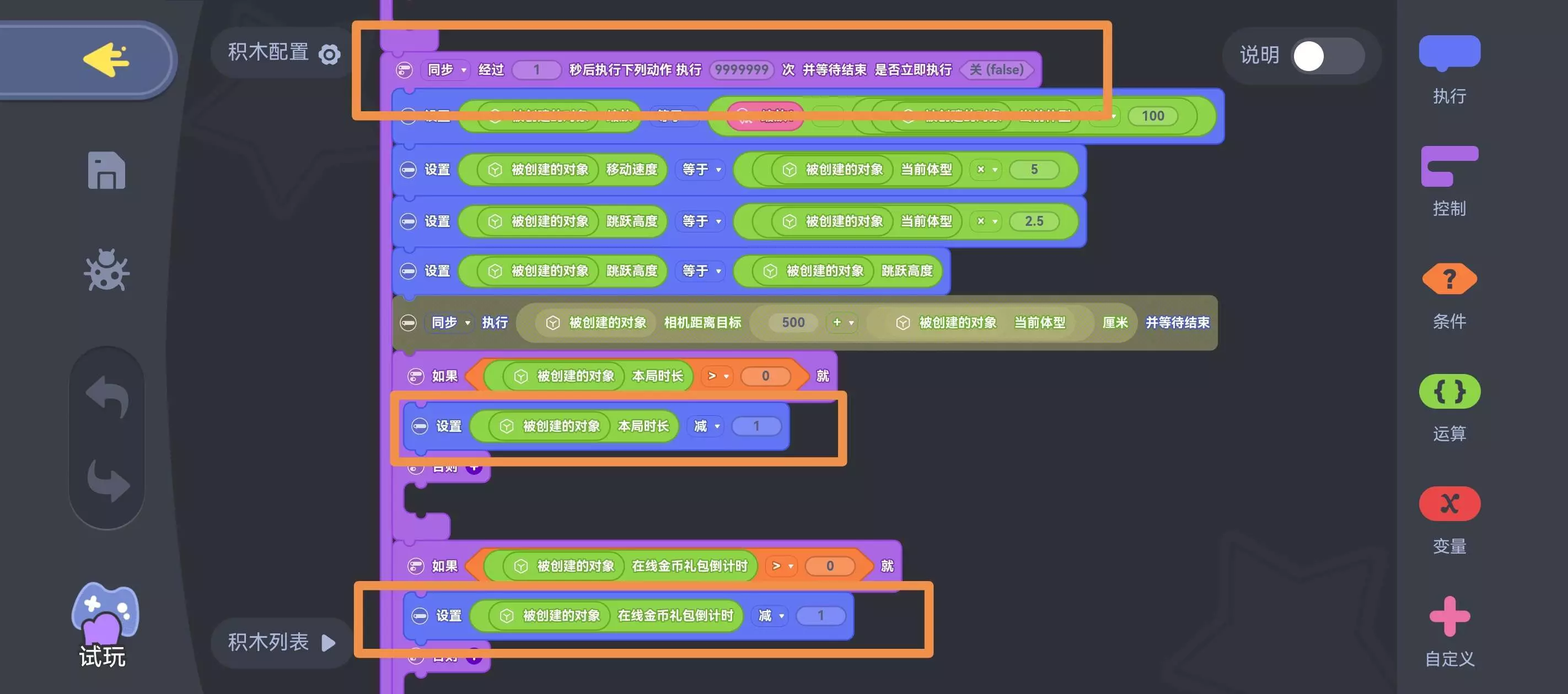 3. 我们在这个积木脚本中,新建一个循环,设置每秒执行一次将我们之前新建的玩家数据-1,这样就能实现倒计时的效果了~