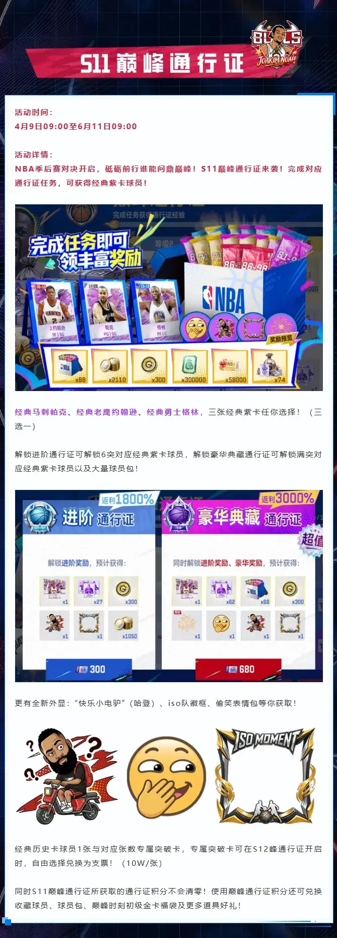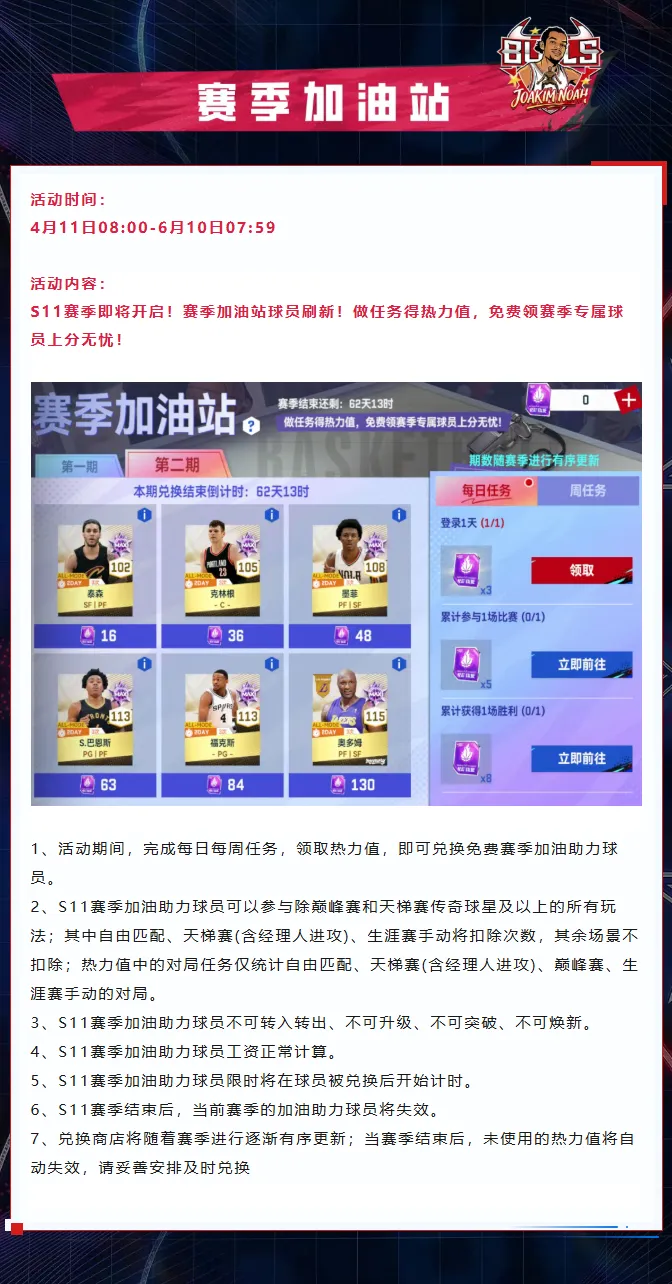 【活动公告】全新回忆“护花使者”公牛乔金·诺上线!S11赛季更新,通行证奖励来袭!