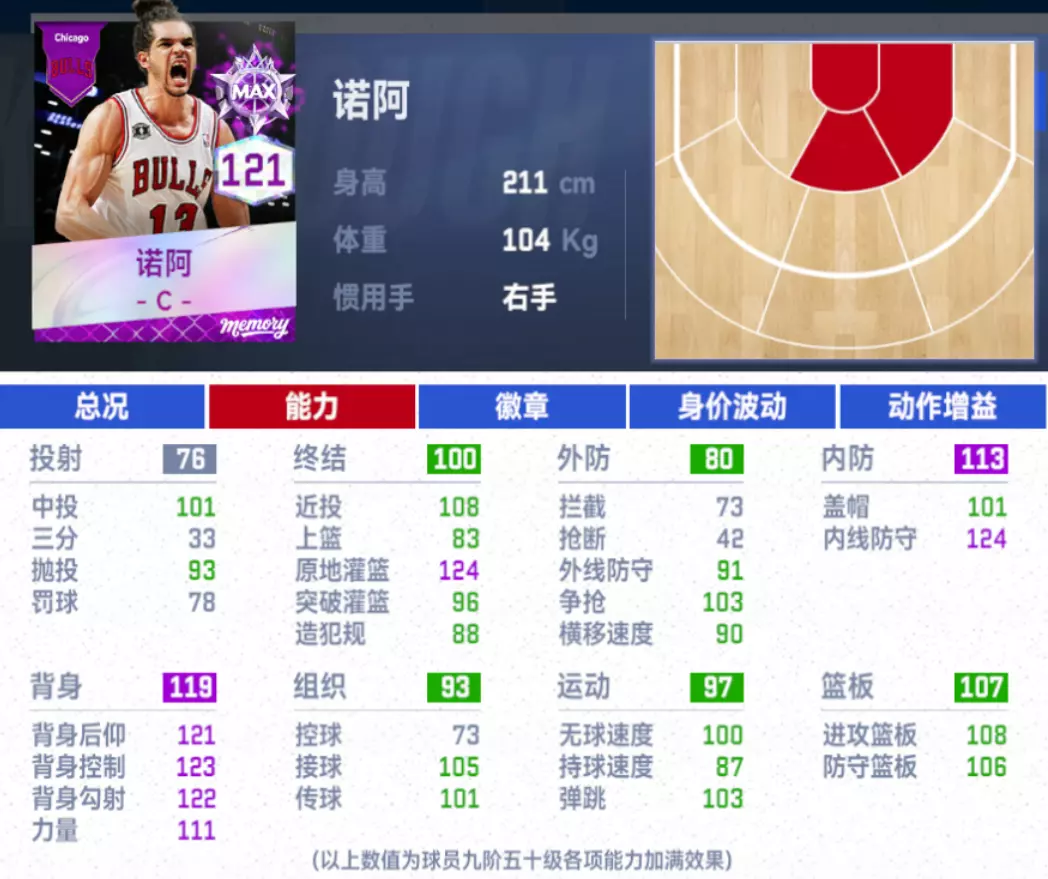 诺阿的进攻不以投射得分为主,但低位进攻却足够实用。背身总值119,背身后仰121、背身勾射122、背身控制123,配合专属的背身后仰与勾手动作包,让他能在低位稳定取分。