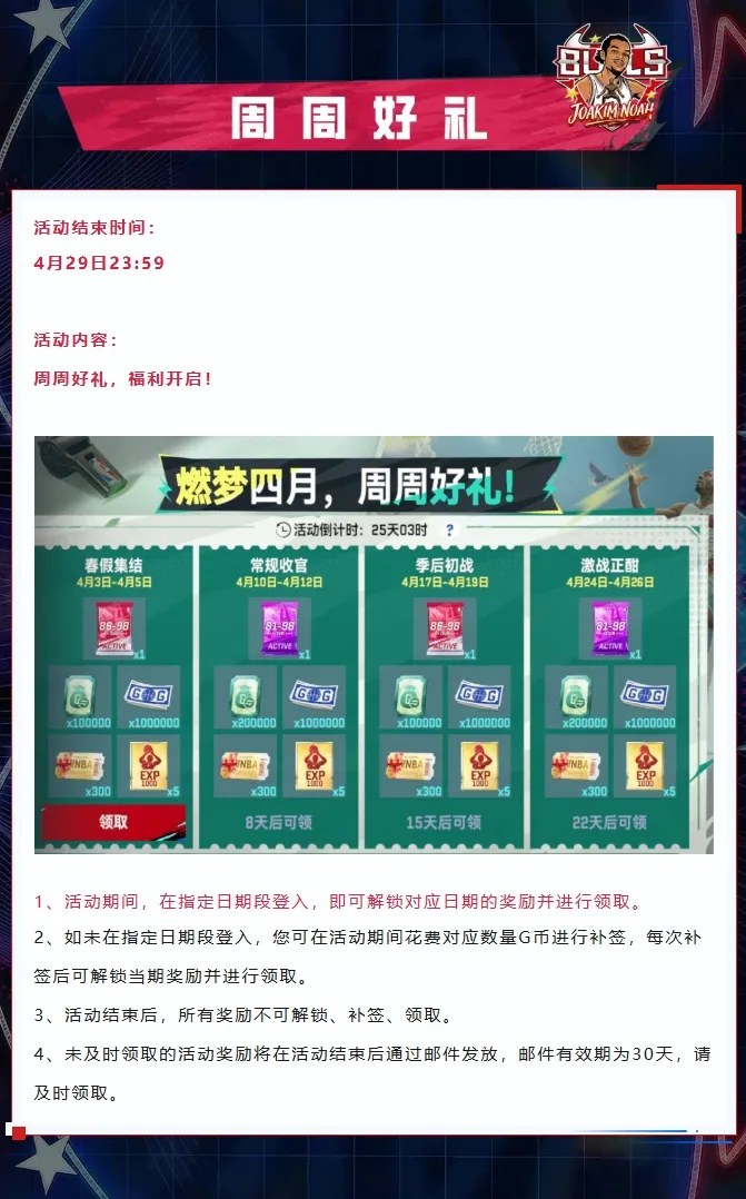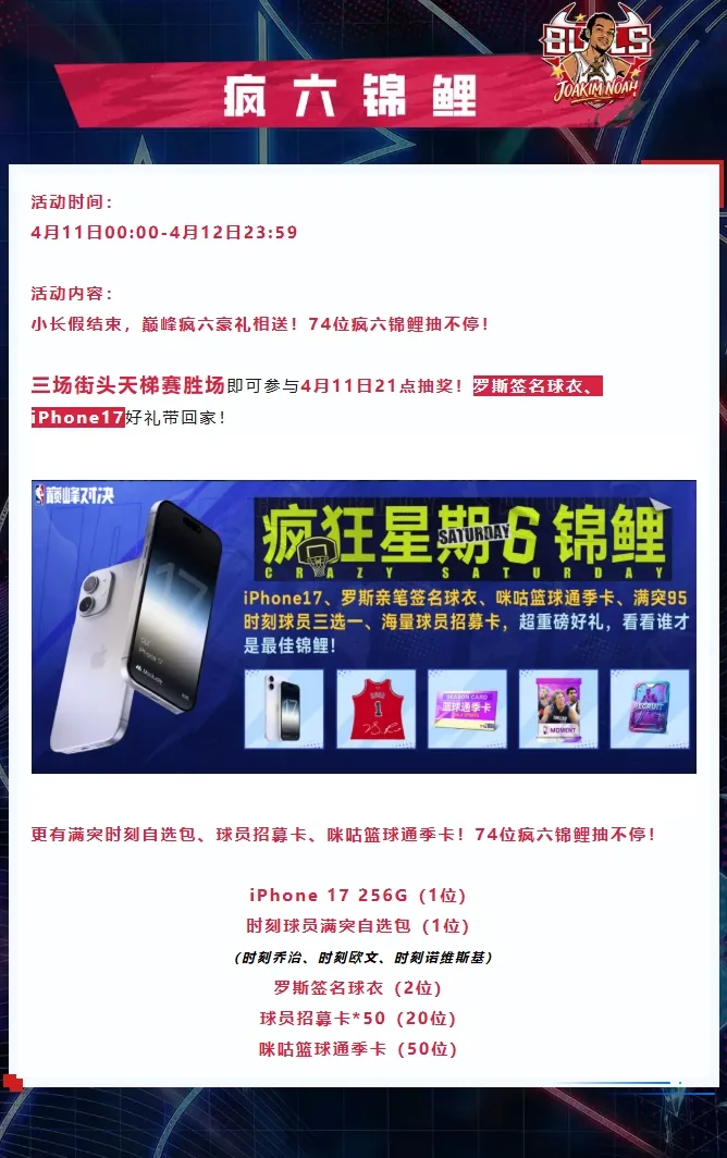 NBA巅峰对决S11赛季4月11日上线,全新公牛回忆球员乔金·诺阿登场,参与限时转盘有机会满突入手。同时开启S11赛季通行证、铸造总冠军戒指、疯六锦鲤等多重活动,还有罗斯亲签球衣、iPhone17等丰厚福利可获取。