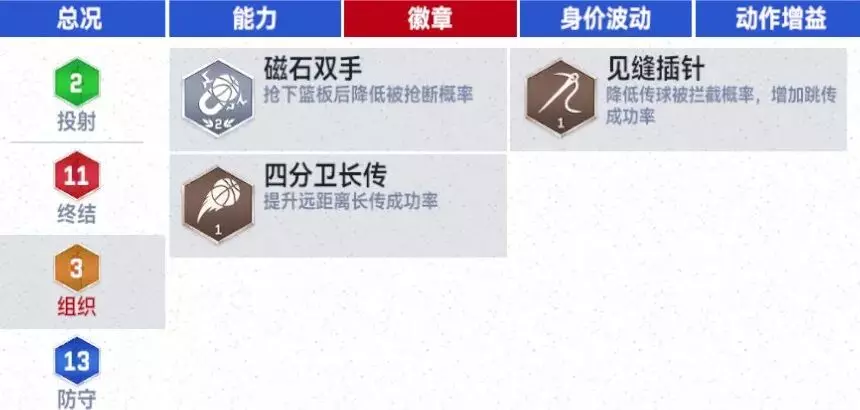 传球101,搭配 【磁石双手】、【见缝插针】、【四分卫长传】等徽章,使其在抢下防守篮板后能迅速策动快攻,成为衔接内外线的重要支点。