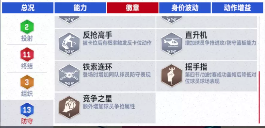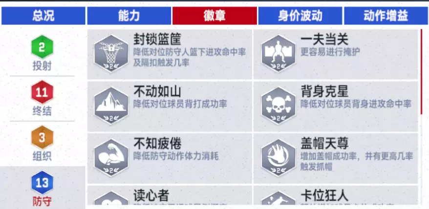 13枚防守徽章配置更是豪华:【封锁篮筐】 、【不动如山】 与 【背身克星】让诺阿能够轻松的防下各种低位单打与冲框进攻。