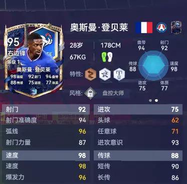 从“失落的天才少年”到2025年的“金球先生”。登贝莱用一座金球奖证明了自己的蜕变。他左右脚无差别轰门,他不讲理变向过人!铜【快速摆脱】特性让他瞬间启动,加上银【灵巧步伐】特性配合银【急升射门】特性,登贝莱就是这支法国队右路最致命的大杀器!