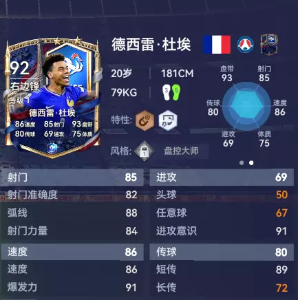 年仅20岁的杜埃是法兰西一颗冉冉升起的新星。在联赛中他的一对一成功次数名列前茅,在法国队他是撕开防线的锐利尖刀,总能在最密集的防守中找到起脚空间。铜【灵动接球】特性能够让他从容卸下任何来球,搭配银【快速弧线球】特性更是让他的射门直挂死角,再强的门将只能望球兴叹。
