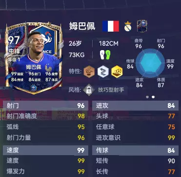 2018年他横空出世随队拿下世界杯冠军,2022世界杯决赛,他攻入三球上演帽子戏法。作为现役最强前锋之一,姆巴佩的实力已经无需赘述。而在法国队的新体系中,他将出任中锋位置,这也彻底释放了他的终结能力。本赛季在皇马场均接近一球的进球效率证明了他就是禁区里最强势的射手。搭配铜【魔术师】特性的花式能力,银【快速摆脱】特性的爆发起步,加上让门将绝望的金【贴地斩】特性,使他足以成为所有对手防线的噩梦。
