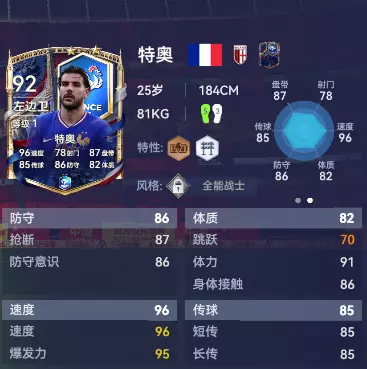 特奥是当今足坛最具攻击性的左后卫之一。2022世界杯半决赛凌空斩破门,是他的代表作。搭配的铜【铁人】特性能够支撑他全场上下飞奔,加上银【拦截专家】特性的防守意识,强化了他能攻善守的特点,特奥的插上奔袭将会是法国队最锋利的左路杀手锏!