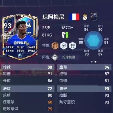 现在的琼阿梅尼已经逐渐成长为欧洲最顶级的防守型中场之一。他的预判、站位和身体对抗都是完全的一流水准,往往能够让对手的进攻在中圈就被掐灭。搭配铜【精准空中传球】特性的同时他还有一脚精准的中长距离转移能力,兼备银【手术刀地面传球】特性与银【拦截专家】特性,从抢断到发动反击,一气呵成。