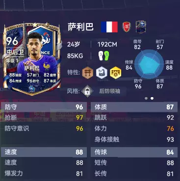 英超中最稳固的年轻中后卫,法国队中于帕梅卡诺的完美搭档。当于帕上抢时,萨利巴永远在可以在身后补位。铜【拦截专家】特性赋予他精准的预判,银【绞肉机】特性在对抗时能让对手绝望,金【铜墙铁壁】特性就是对他最好的定义!