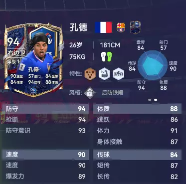 孔德能成为世界级右后卫,靠的就是顶级卡位意识和一对一防守技术。铜【一脚传球】特性让他能快速出球发动进攻,银【绞肉机】特性带来的缠斗让对方球员寸步难行,再加上银【铁人】特性,他将成为法国队右路最可靠的铁闸!