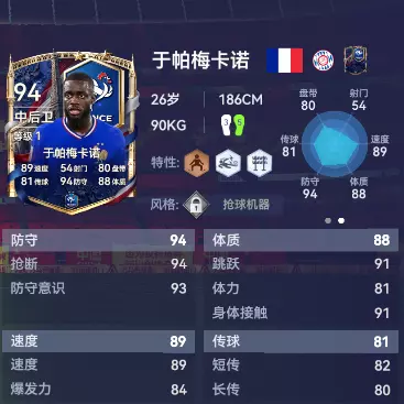 慕尼黑的后防巨塔,上抢型中卫的天花板。于帕梅卡诺的压迫感极强:一旦判断对手要转身,他就会像猎豹一样扑上去。凭借铜【敏捷】特性的能力加之银【闪电滑铲】特性的精准和银【拦截专家】特性的判断。于帕梅卡诺绝对不会给前锋任何喘息机会!