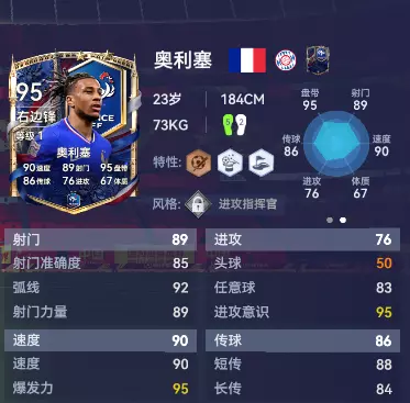 奥利塞是如今法国队的10号位核心,也是名副其实的进攻“大脑”。他的视野、节奏感、最后一传的能力,让法国队的中场再次有了“齐达内之后”的创造者。他拥有铜【手术刀地面传球】特性以此撕开防线,还能用银【魔术师】特性般控球稳住局面,最后以银【精准推杆】特性冷静终结。从致命一传到破门,奥利塞全都能包办!