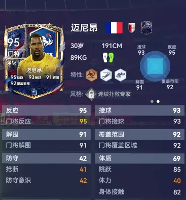迈尼昂是洛里退役之后的法国新晋门神,他在AC米兰的四个赛季中,两次赢得了意甲最佳门将。他的反应速度、出击判断、脚下出球全部是顶级水平。他不仅是防线最后的保险,更是反击的第一发起点。铜【门将低轨开球】特性让他能精准找到前场队友,银【鱼跃飞扑】特性搭配银【快速反应】特性则让他能在咫尺之间稳稳覆盖球门死角,扑出必进球。