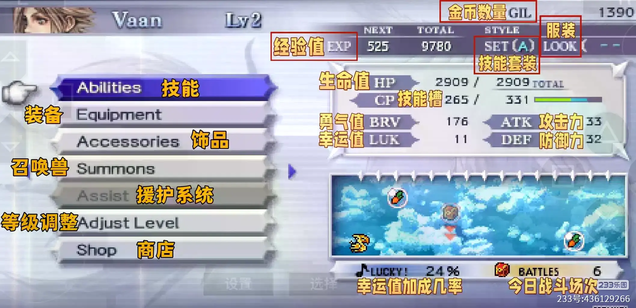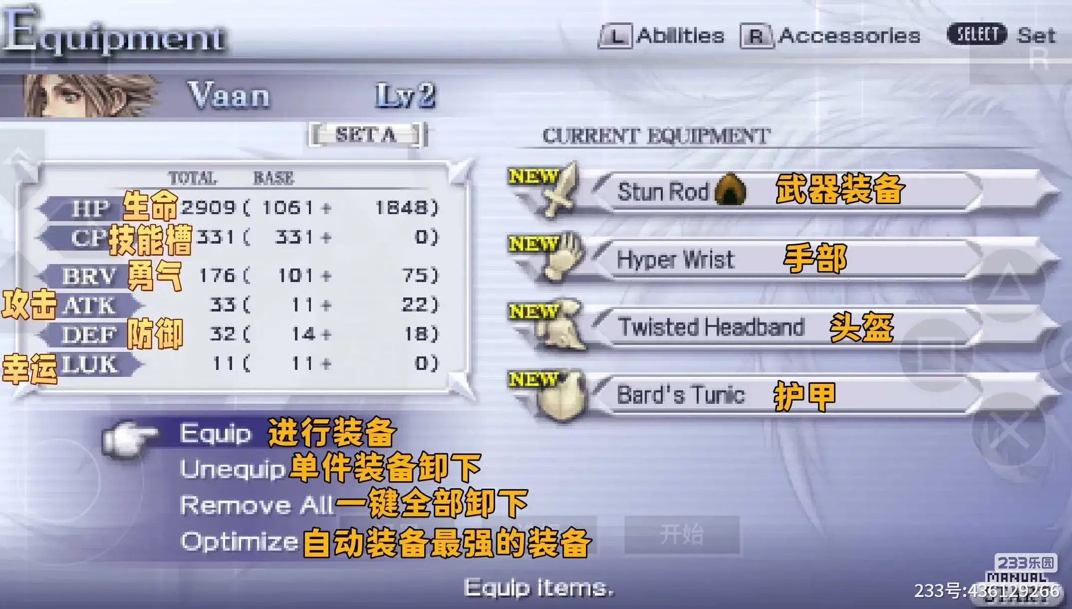 由于《最终幻想纷争012(PSP)》这款游戏只有剧情有中文,游戏内的各选项均为英文,为了方便各位玩家快速了解各选项的中文意思以及作用,特此撰写此篇《新手入门&中英文翻译对照》!!!!
