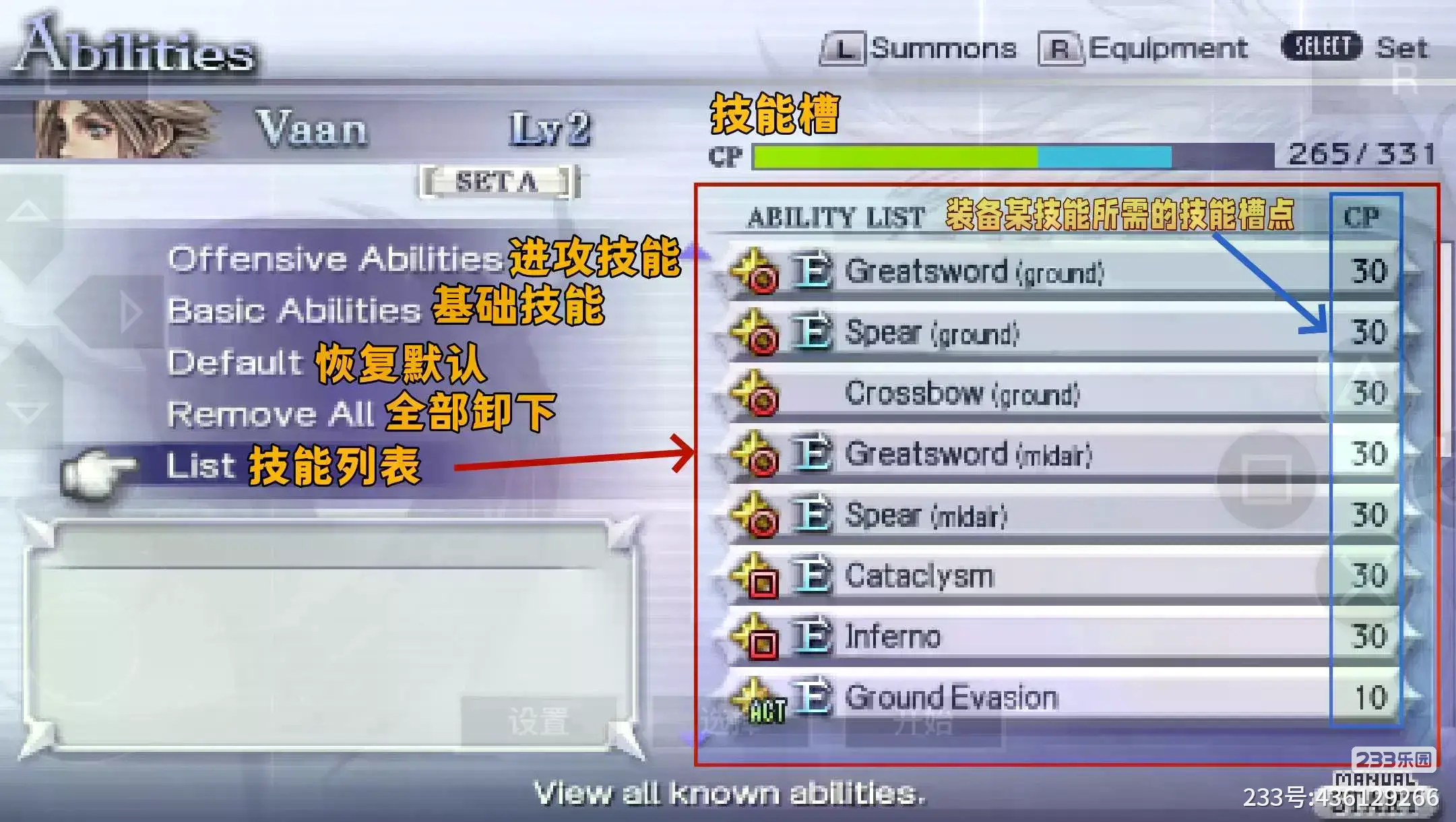 能查看已获取的技能;而各技能的CP就是我们装备技能的时候,需要消耗的技能槽数量,例如下图中我已经消耗了265点技能槽,而技能槽最多是331,则表明我还能使用66个技能槽