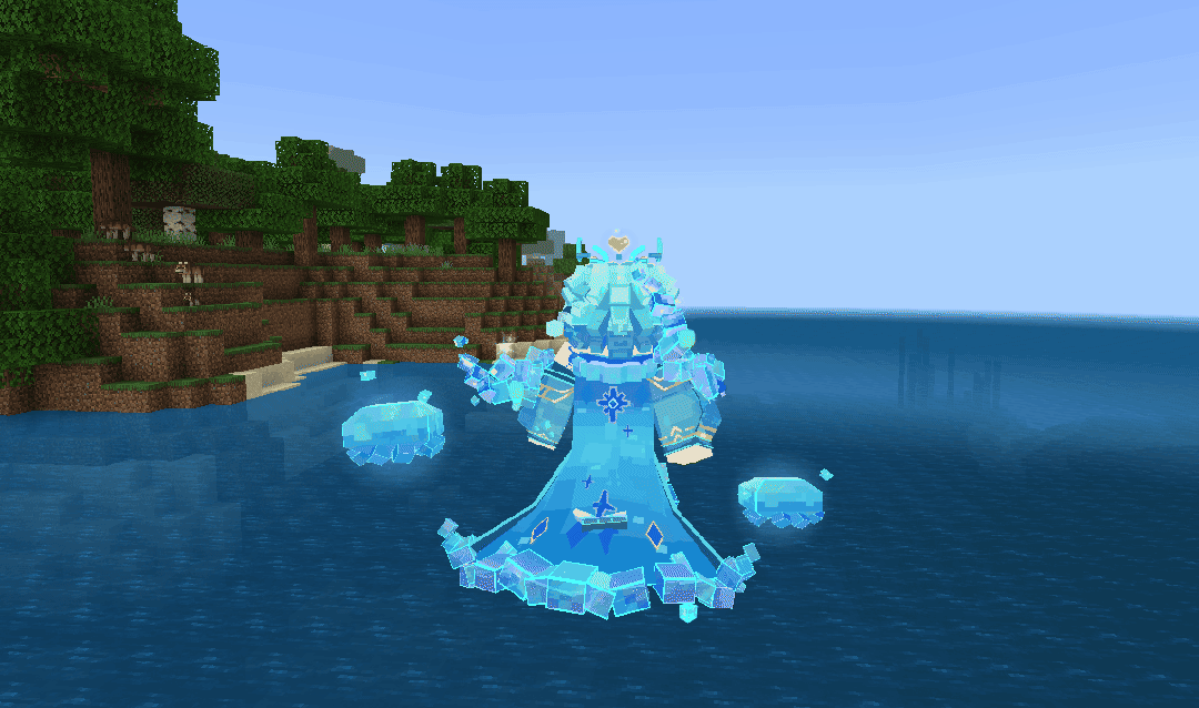 她有着半透明的水蓝色身躯,发丝是流动的海带与流光,周身萦绕着变幻的水纹光晕,指尖能凝结出纯净的水珠,脚步踏过之处,荒芜的海床会生出海草,死寂的礁石会绽放珊瑚。作为深海凝露唤醒的方块精灵,她是海洋生机的化身,也是上古精灵意志的延续。