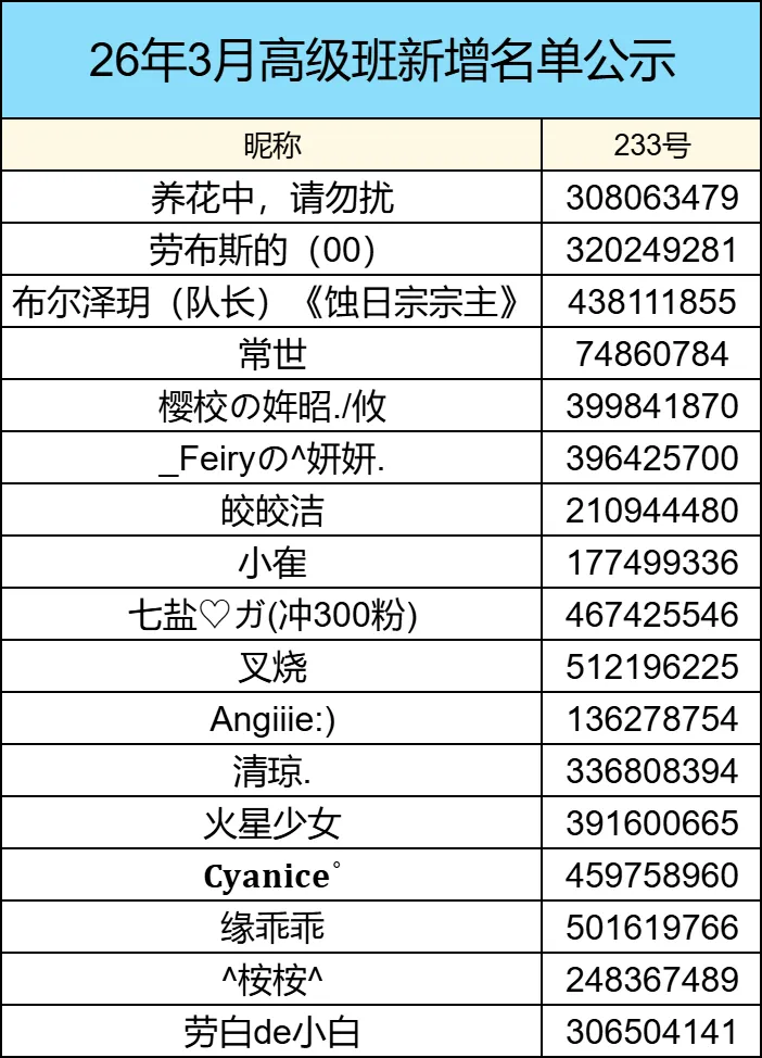 ⭐经考核后,每月公示两次高级班新成员名单,未上榜的小伙伴可重新参与考核。