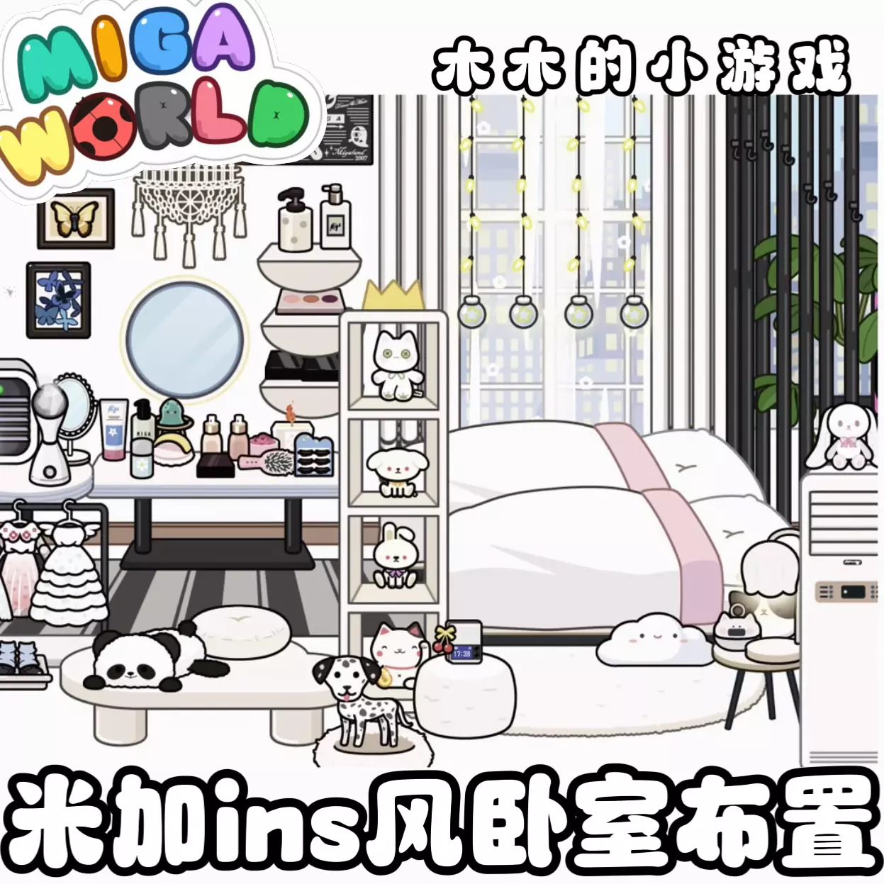 这是233乐园里《米加小镇世界》的ins风卧室布置分享,展示了从放置落地窗、纱帘遮光帘,到添加床、玩偶置物架、矮凳,再到布置休闲区和化妆区的完整布置过程,打造出清新温馨的ins风卧室。