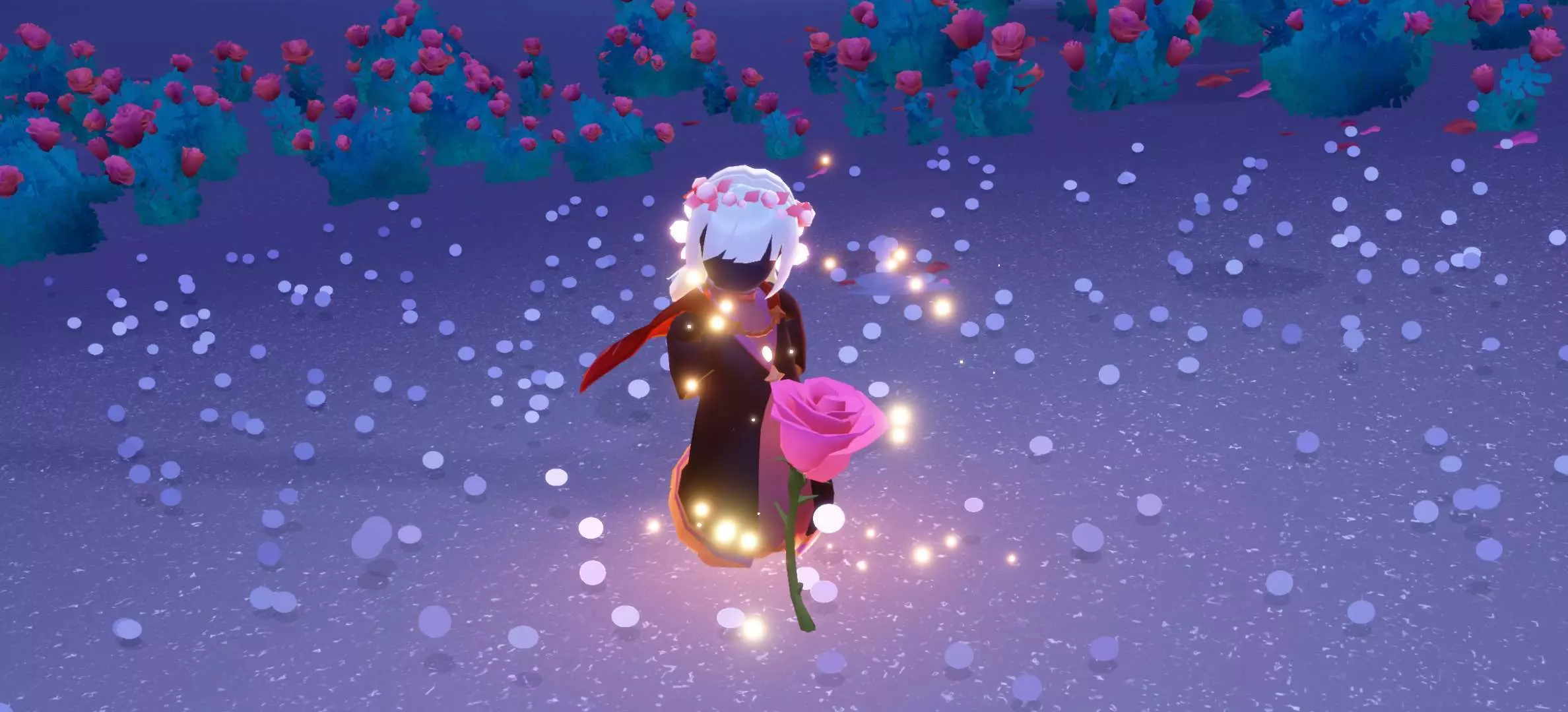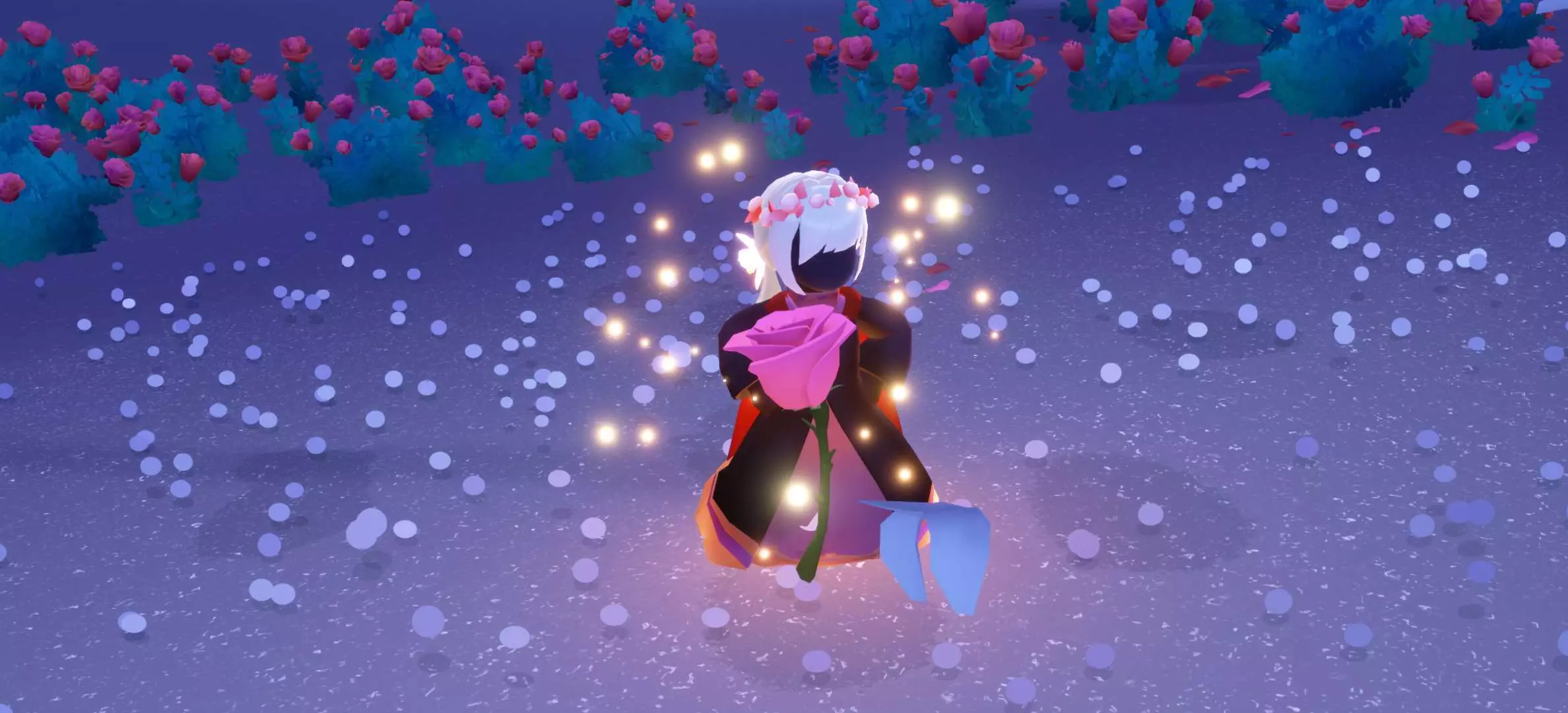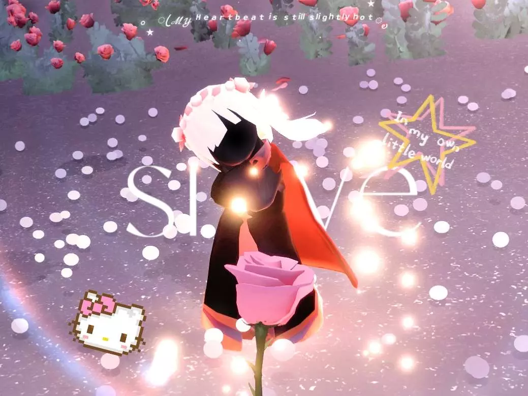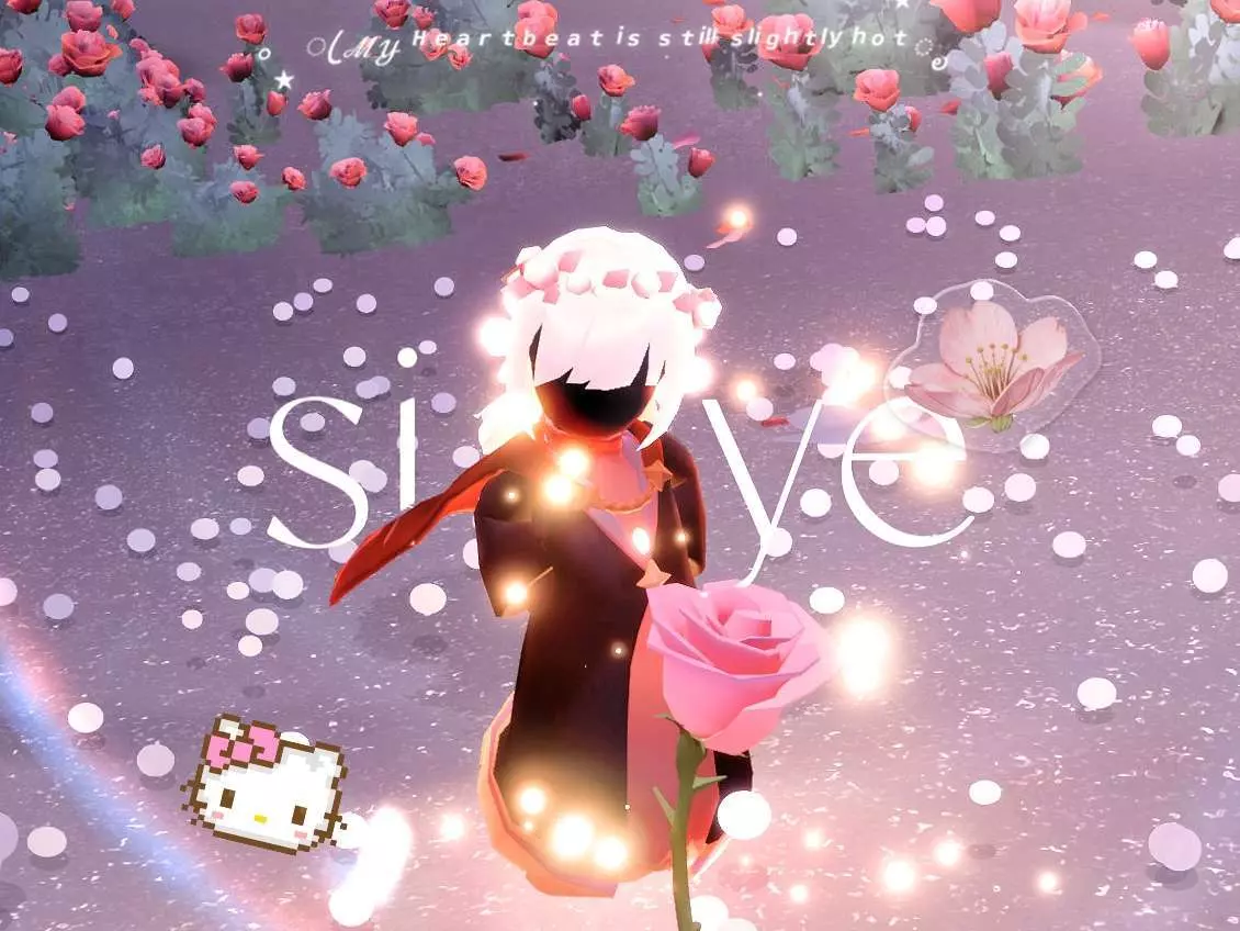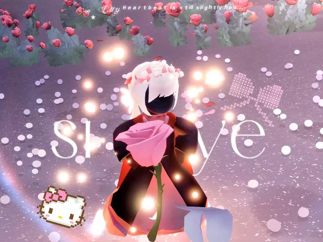 这是一篇光遇创作投稿的社区帖,作者分享了一组光遇游戏美图,图中光遇角色身处漫山玫瑰的场景中,氛围浪漫温馨,作者还申请精华,不接受伸手党。