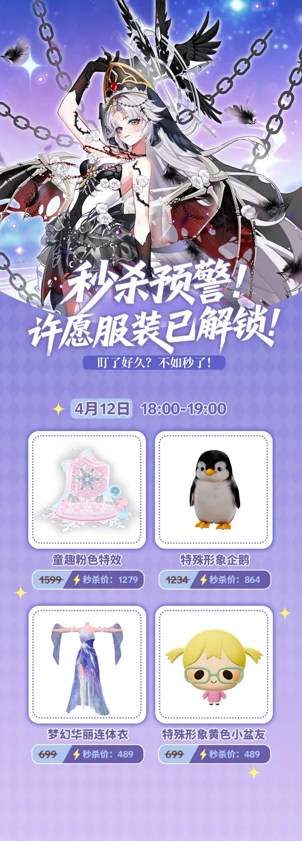 💎首场周年心愿秒杀的反响极其热烈,感谢大家对233角色二周年庆典的支持。如果你在首场由于竞争激烈没秒杀到,那么本周日(4月12日)18:00 开启的第二波秒杀福利,请务必锁定!