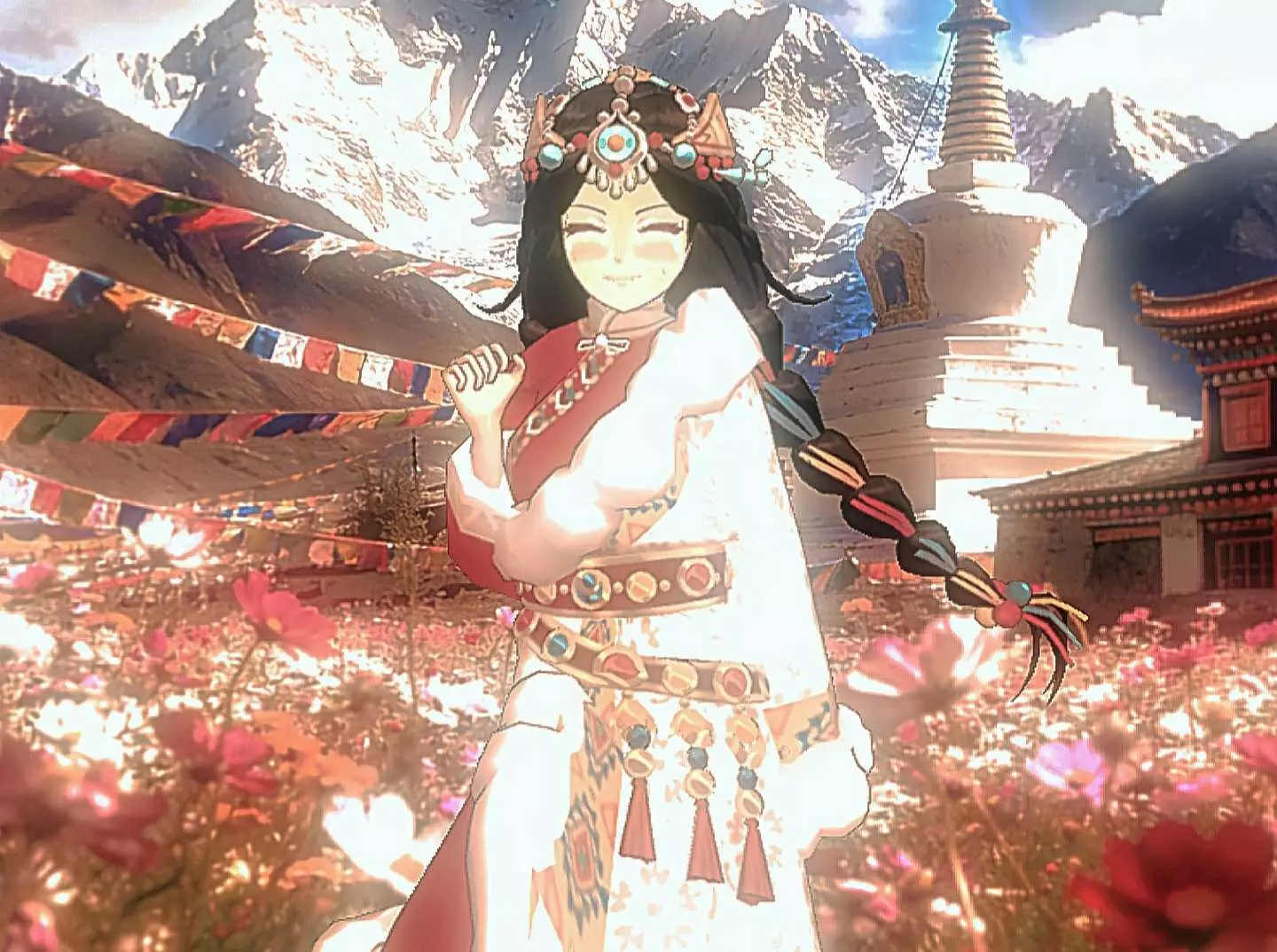 这是参与#云巅藏韵#创意活动的作品,展示了身着藏族服饰的虚拟人物喻言,搭配雪山、白塔等藏地背景,还呈现了视频制作过程,尽显藏地风情与创意。