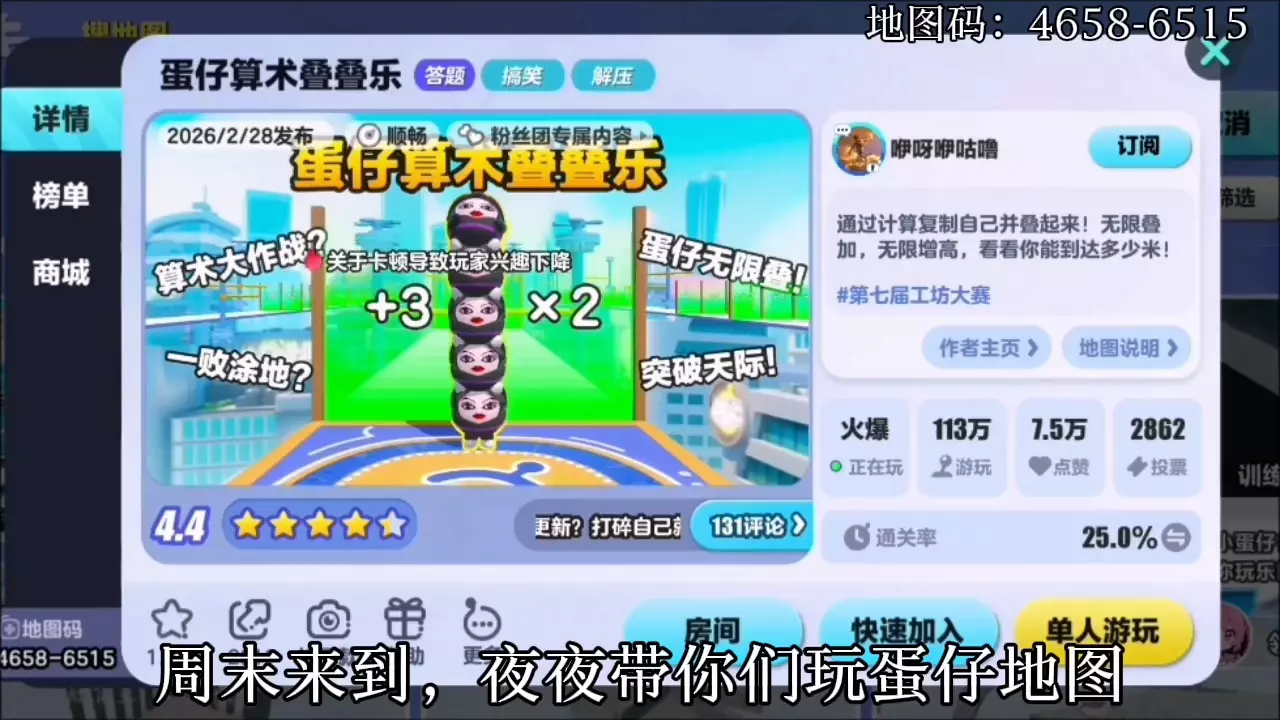 这是蛋仔派对的玩家自制地图《蛋仔算术叠叠乐》,地图码为4658-6515,玩家需通过选择算术关卡来叠加蛋仔,不断增高,该地图兼具答题、搞笑、解压属性,欢迎体验。