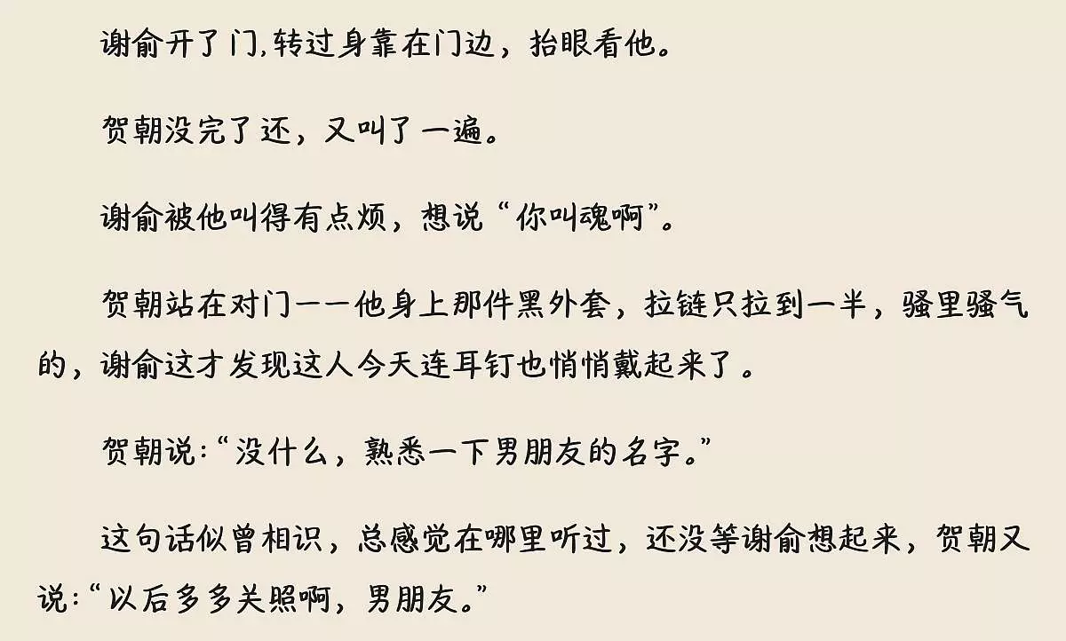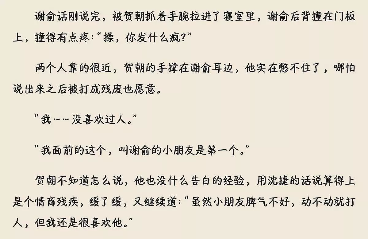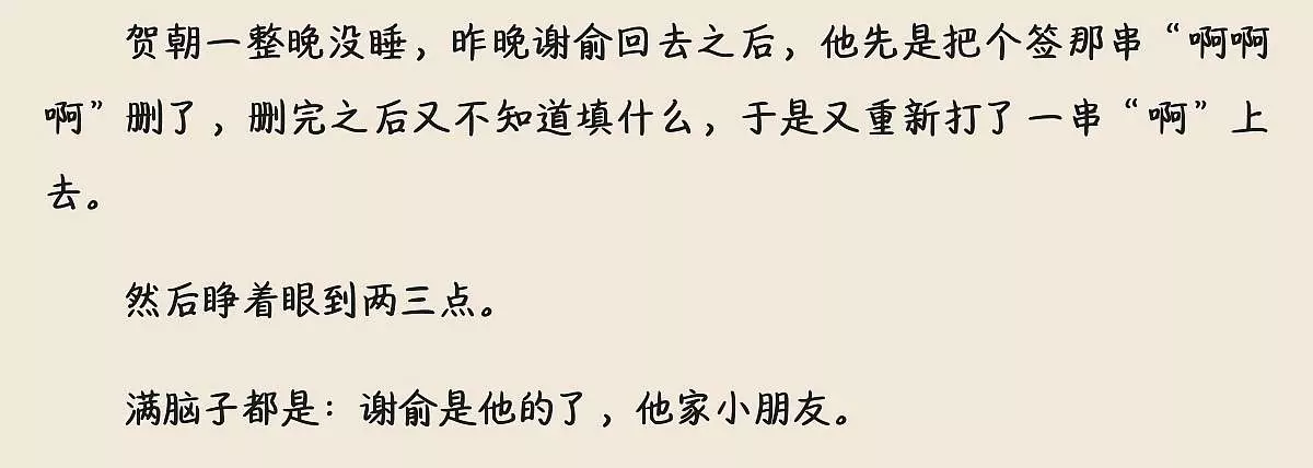 这是小说《伪装学渣》里的朝俞相关内容,贺朝向谢俞告白,称谢俞是自己第一个喜欢的人,告白成功后贺朝兴奋得整晚没睡,满脑子都是谢俞,甜蜜互动让粉丝直呼好嗑。