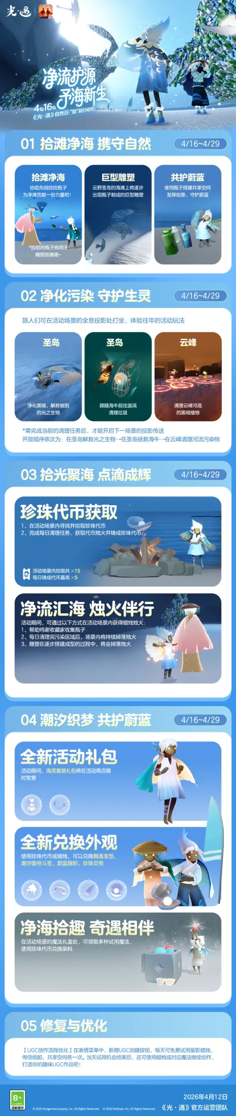 《光·遇》自然日活动将于4月16日-4月29日开启,活动围绕守护海洋展开,包含拾滩净海、净化污染等玩法,旅人们可获取珍珠代币兑换外观,还能获得烛火,同时有全新活动礼包上线,还有UGC创作流程优化等内容。