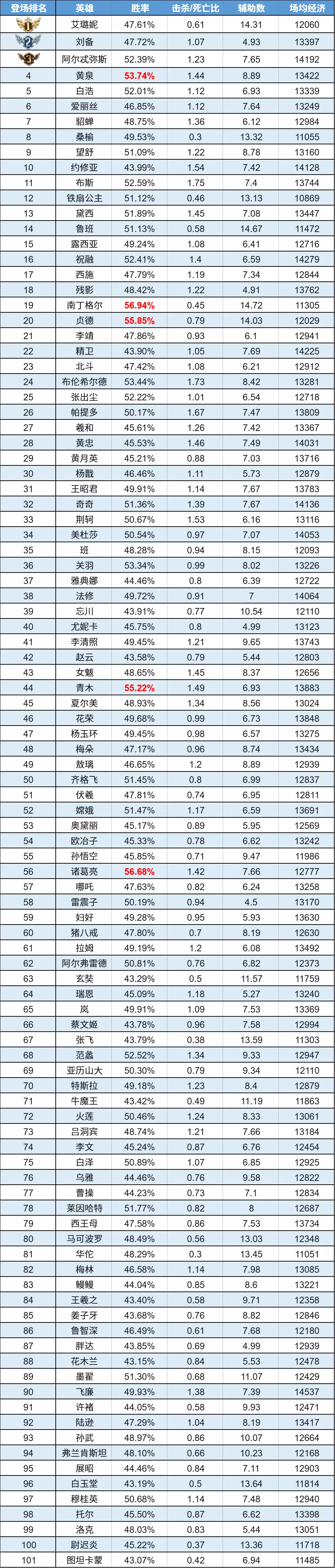 排序:按登场率高低排序,标红为胜率前5