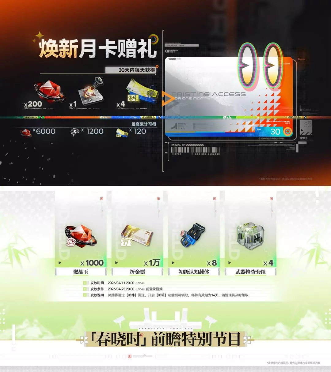 《明日方舟:终末地》优化进展与版本前瞻 嵌晶玉×1000(游戏内邮件发放) 折金票×10000(游戏内邮件发放) 初级认知载体×8(游戏内邮件发放) 武器检查套…