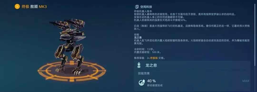 终极敖顺的作战核心在于其无与伦比的三维机动性。激活技能【龙之息】后,机体不仅进入隐身状态,更可获得40%的移动速度加成(MK3),配合飞行姿态带来的高速位移,常使指挥官在急速变向中难以稳定输出。要想在高速机动中实现枪枪命中、伤害打满,预判走位与跟枪输出便成为关键的技术门槛。