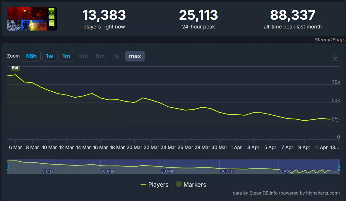 报告显示,Steam平台玩家的平均游戏时长为28小时,其中22%的玩家时长超过50小时,7%的玩家超过100小时。自那时起,这些数字无疑还会有所增长。 《失落星船:马拉松》发售时并未进入Steam最热门游戏前十名。在其最大的平台Steam上,同时在线人数峰值为88,337人。相比免费"服务器压力测试"期间的143,621人峰值,这一数字有所下降(游戏目前售价168元)。自一个多月前发售以来,该峰值已下跌68%,截至本文撰写时,最近一次峰值为25,113人。