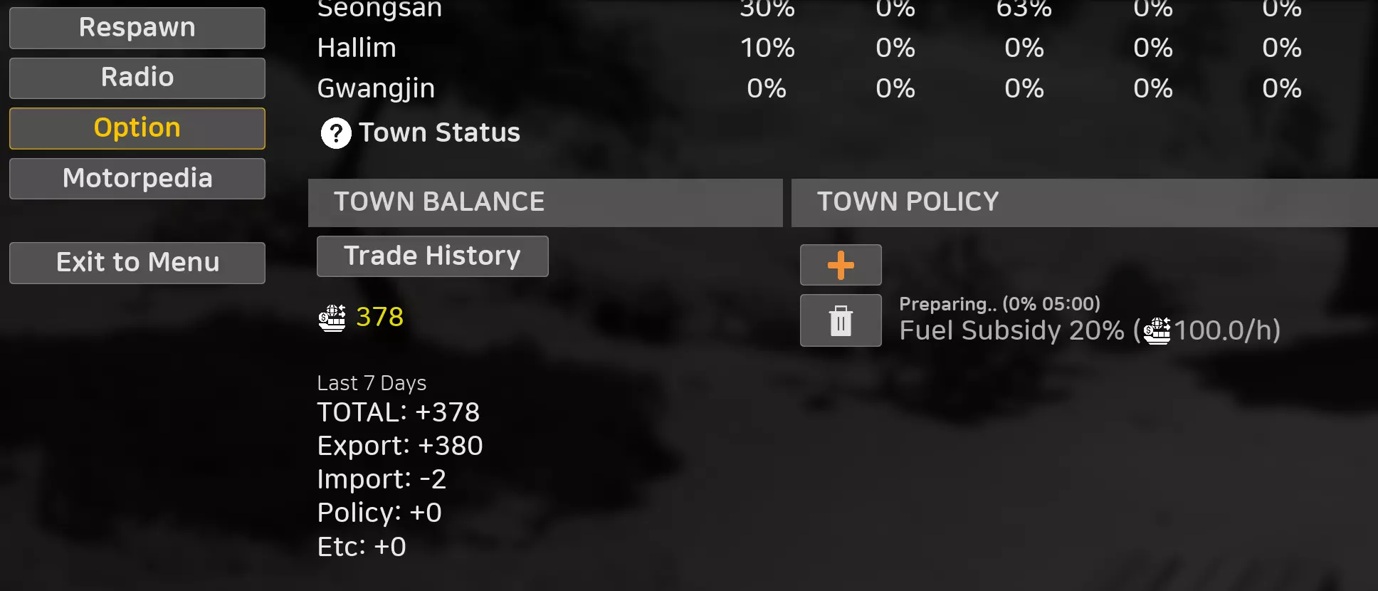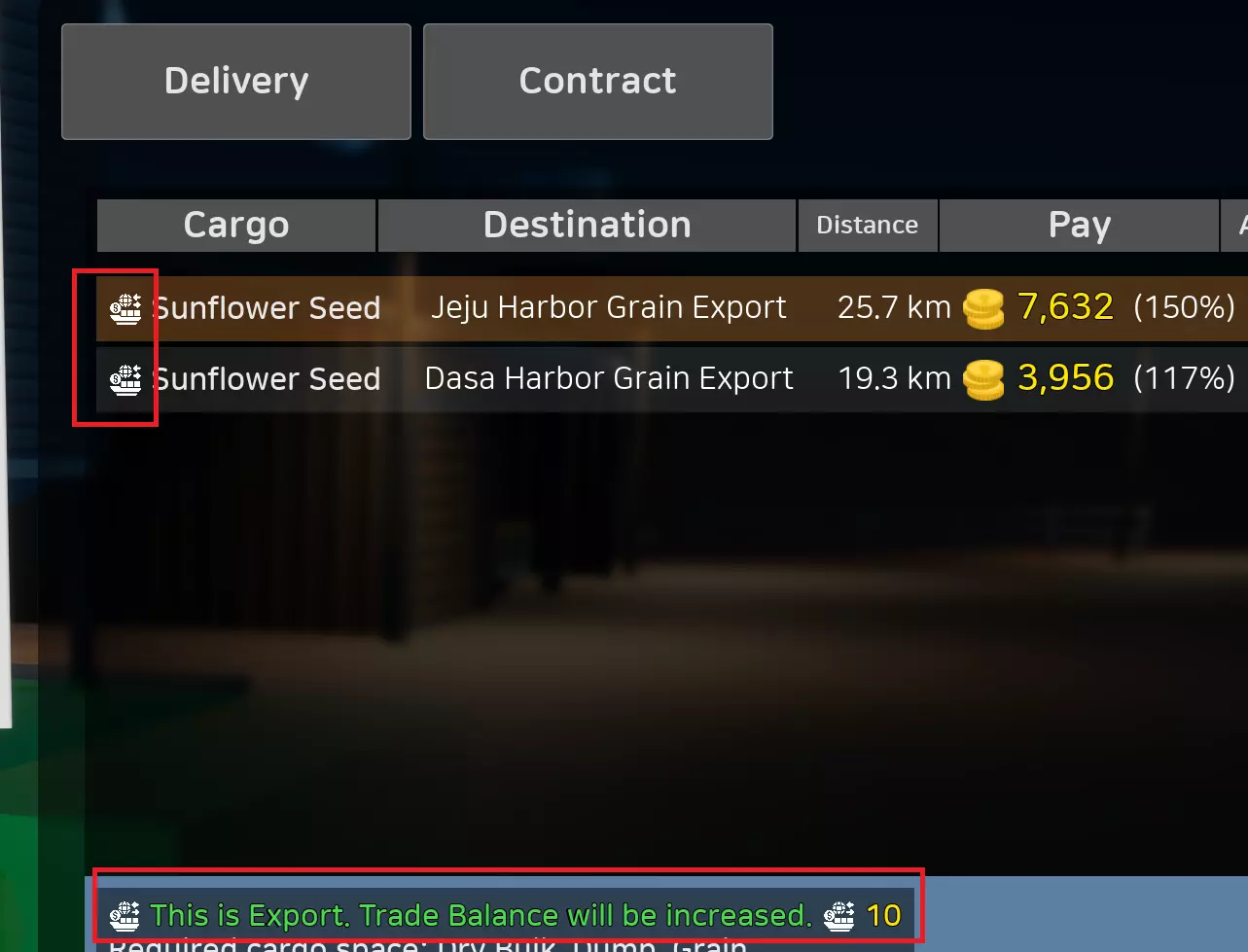 交易 港口的部分货物投放点现已可出口货物用于交易。 港口的部分货物提取点现已可进口货物用于交易。 每次进出口都会改变交易平衡,你可以在游戏内菜单中查看该平衡。 交易平衡设有上限和下限。