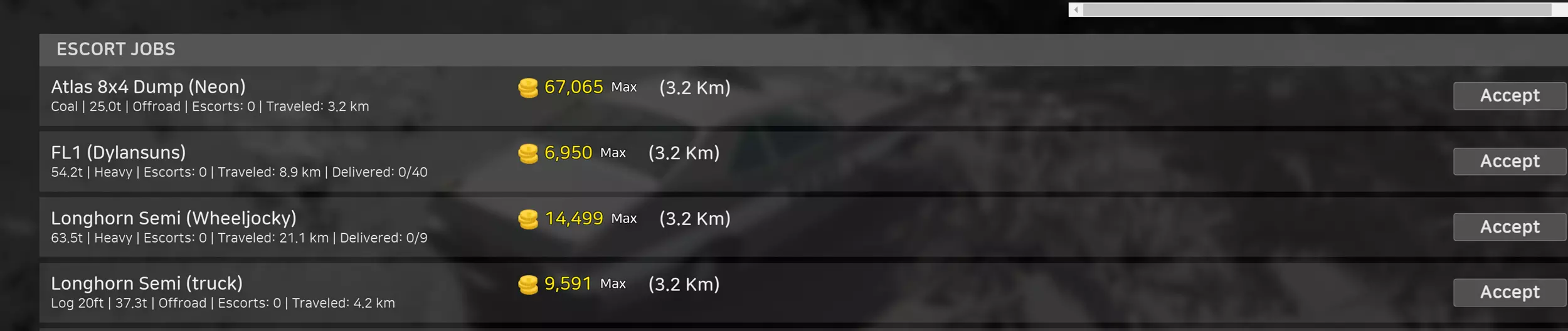 护送任务 现在你可以承接超大型或重型货物的护送任务。 在游戏内菜单中查看任务列表。接受任务后,跟随标记找到护送车辆并开始护送。 接受任务前需先安装护送许可证。 以下类型的运输可承接护送任务: 超大型货物(变压器、坦克) 重型货物:重量超过30吨 越野重型货物:3吨且运输路线为越野路段