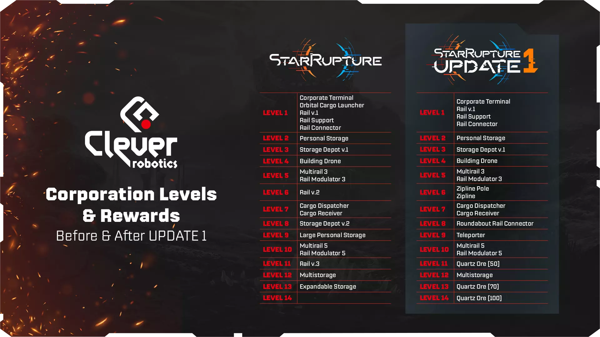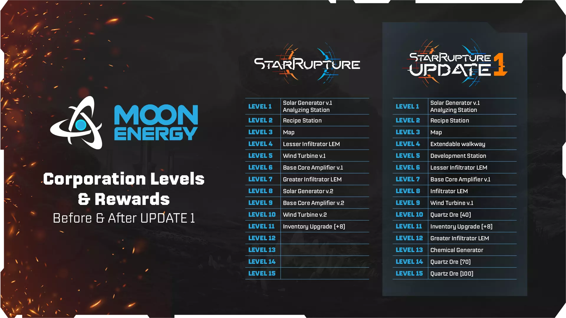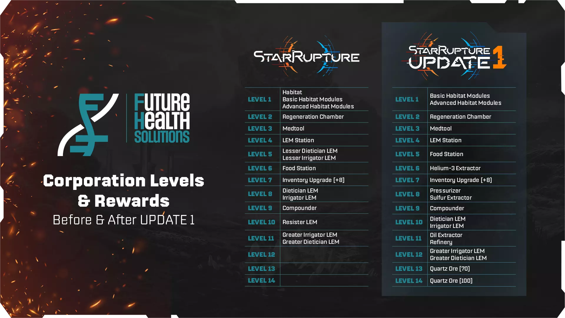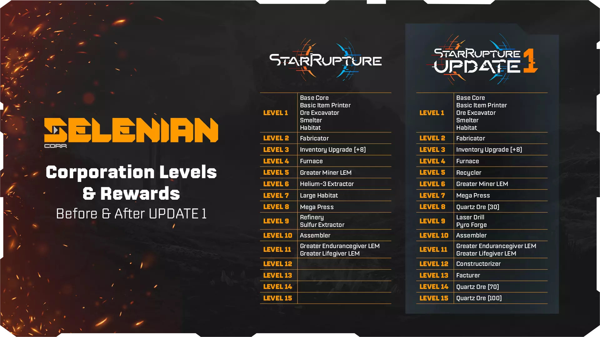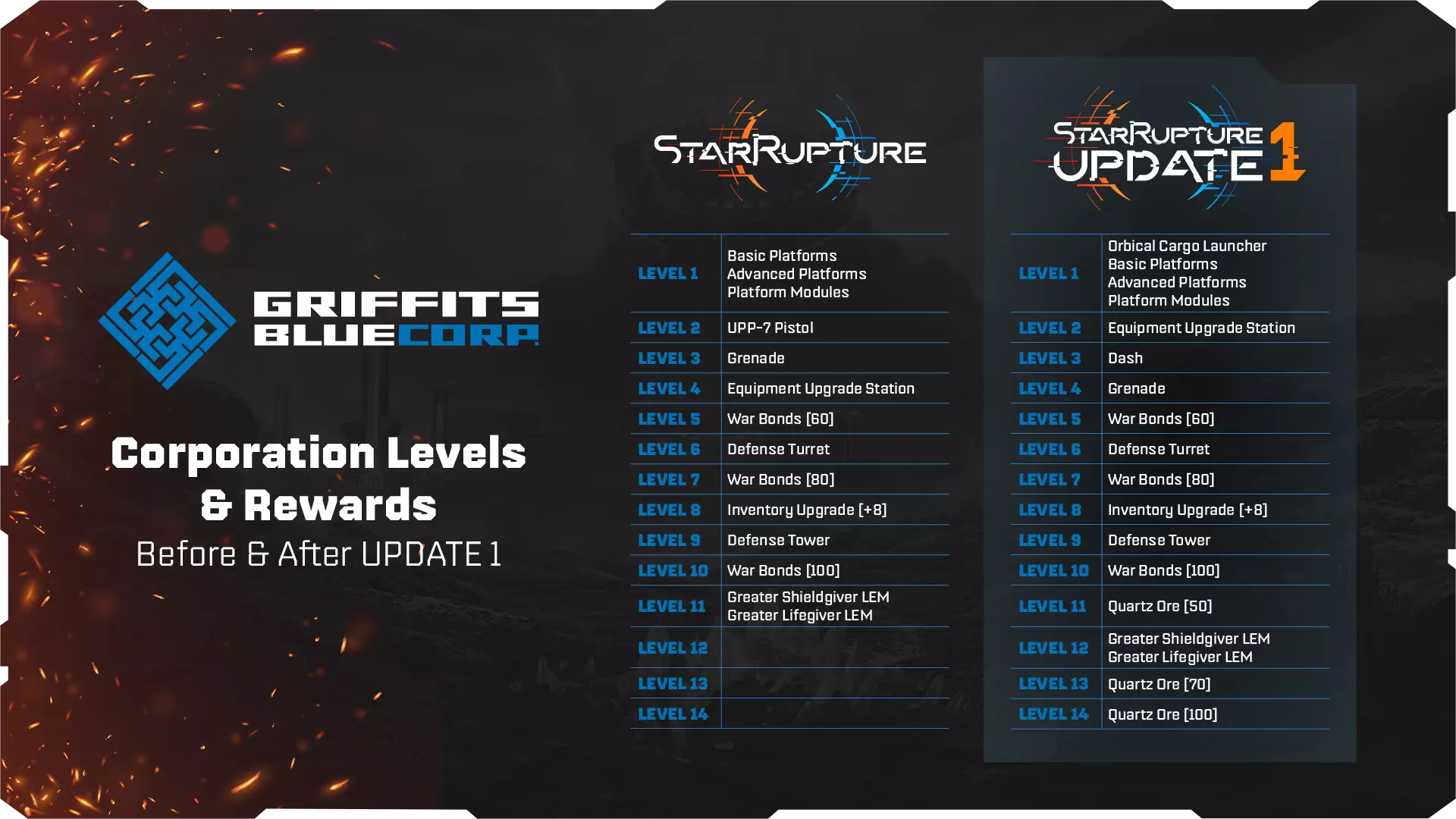 《星际裂变》更新内容 1. 在更新1中,所有公司等级将重置为1级,更新前的进度将以数据点形式恢复。 2. 你可以在公司终端分配获得的数据点,快速解锁公司等级和新奖励。 3. 所有之前解锁并建造的建筑将保留在地图上并继续运行,但在公司终端或研发站解锁前无法再次建造。 4. 部分原游戏初始可用的机制现在需要达到特定公司等级才能解锁,例如走道和冲刺。 5. 手枪不再作为公司等级奖励提供,你可以在装备升级站与其他武器一起制作它。死亡时,你将失去所有携带的武器,包括手枪。因此,你需要更加密切地关注自己的生命体征和生命值。 以下是公司等级的变化以及各等级可获得的奖励: