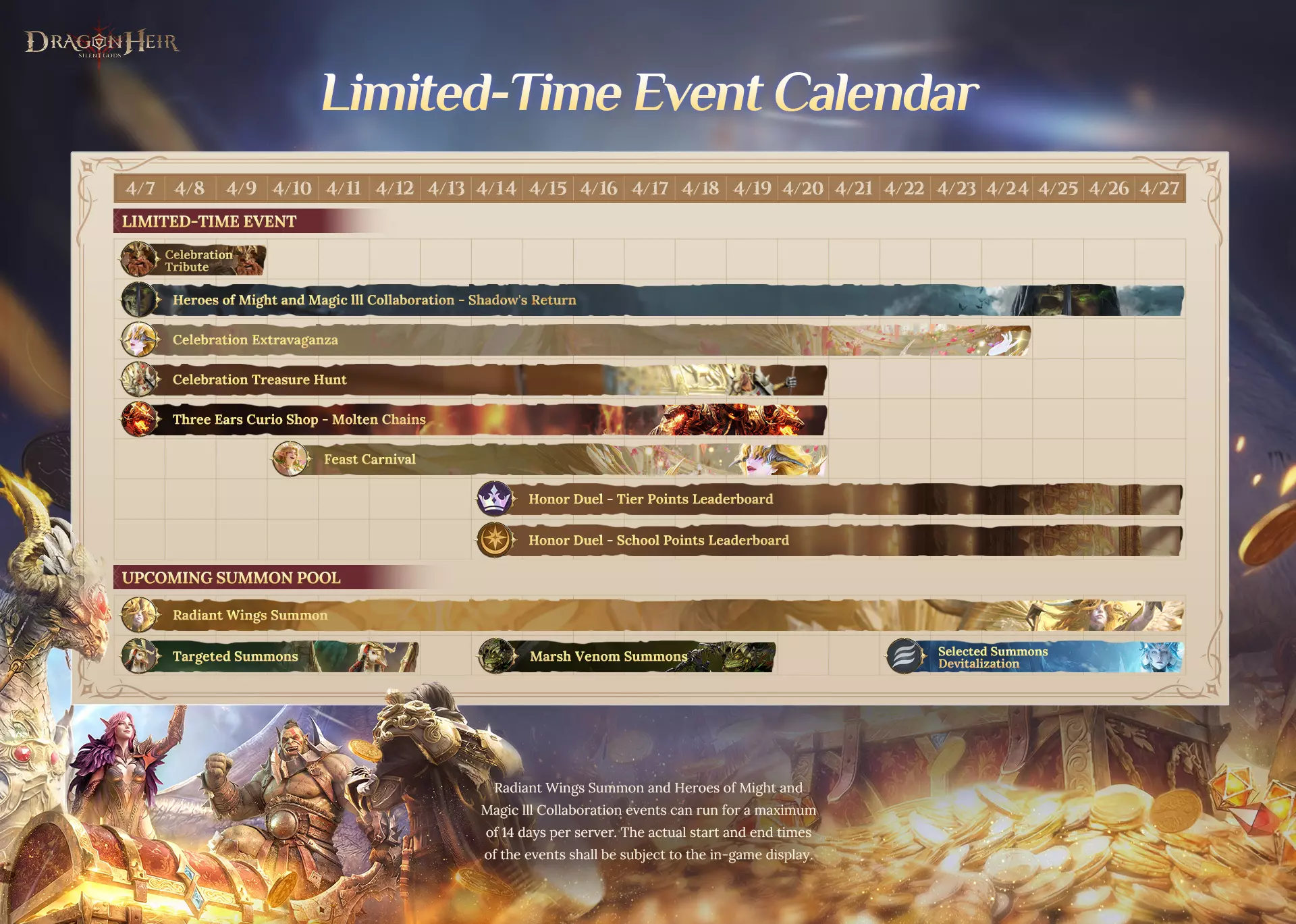 旅行者们,随着【棋刃之颂】的到来,活动日程已重新调整,召唤卡池也同步更新。 赛季合并后,召唤卡池不再与服务器进度或赛季阶段挂钩。所有卡池将在全服务器同时开放,让每位旅行者从一开始就享有平等的获取机会。展望未来,我们还将推出更多由玩家票选的学派卡池,助你更轻松地获取心仪的英雄。 为了帮助大家规划接下来的游戏行程,我们准备了三份日程表: 【棋刃之颂赛季日程表】 涵盖最新赛季的完整日程,包括核心进度活动和关键游戏里程碑。 【新手赛季日程表】 新玩家将从此处开启旅程,遵循结构化的成长路径。完成一个赛季后,他们将进入最新赛季。 限时活动日历 追踪特定时期内的重大活动、合作内容以及召唤池。 查看与你当前赛季匹配的日历,提前规划你的旅程。 棋盘已备好——现在该你行动了。
