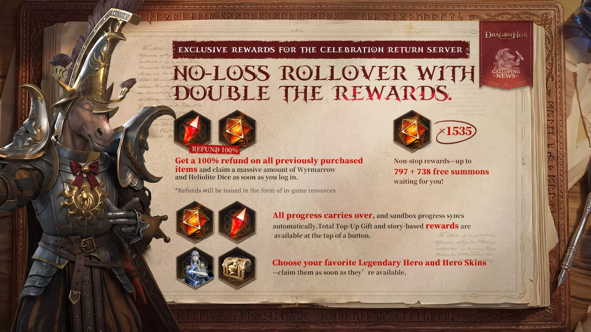 过往充值的资源可以以游戏内资源的形式回收,实现无损回归?没错。 而且,你无需从零开始。 1535次召唤机会已为你准备就绪,重建阵容将比以往任何时候都更快。想要完…