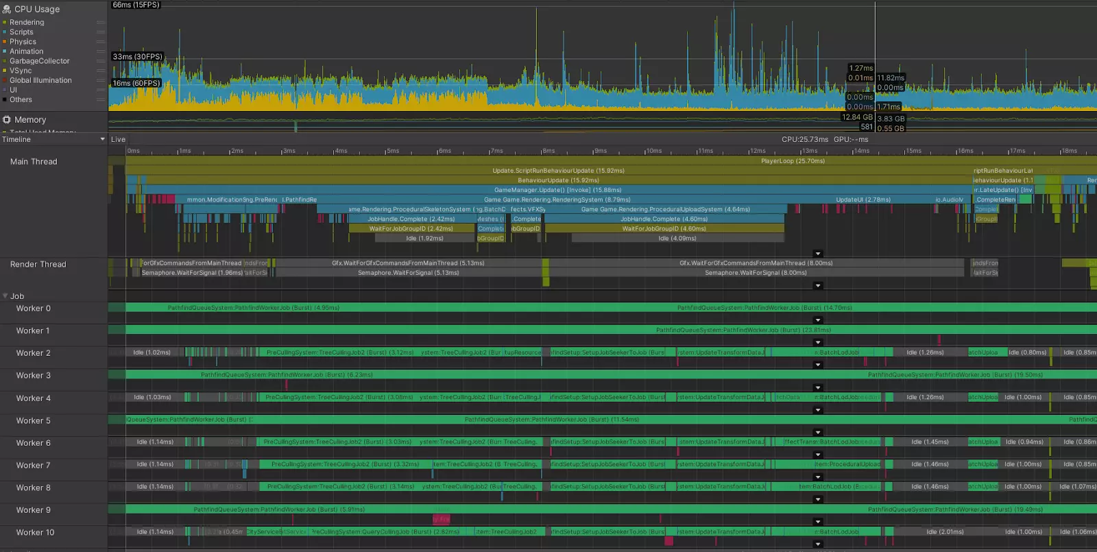 我们使用Unity Profiler来追踪寻路性能瓶颈。在这种情况下,许多CPU线程都在忙于寻路及相关计算。 提升性能的措施: 在之前的更新中,我们已针对性能问题应用了一些简单修复。例如,在较低硬件设置下降低阴影分辨率,根据所用硬件自动匹配图形质量设置,以及在低端硬件上禁用部分最消耗性能的效果,如SSGI。 虽然性能问题仍需更多调查、优化和尝试不同解决方案,但我们对提升性能时应优先处理的事项已有大致思路。我们目前正优先处理LOD(细节层次)和影响渲染的算法,这将提升GPU端的性能,即使在你最小的城市中也能立即感受到变化。我们同时也在研究不同CPU和显卡的性能限制。 我们已准备了一个基准测试工具,它能让你在补丁更新前后检查性能变化,以及更新对你电脑性能的影响。该工具将包含在下次补丁中,如果一切顺利,计划于本月底发布。