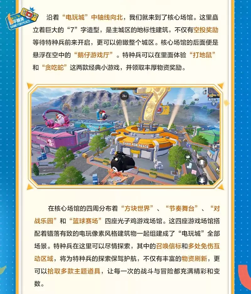 《和平精英》将开启七周年庆,4月14日上线“电玩嘉年华”主题海岛玩法,设有电玩城主城区与分城区,包含多种互动玩法、专属载具鹅仔和特色道具,为玩家带来全新竞技体验。