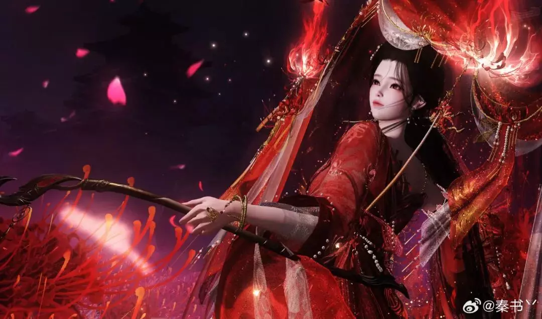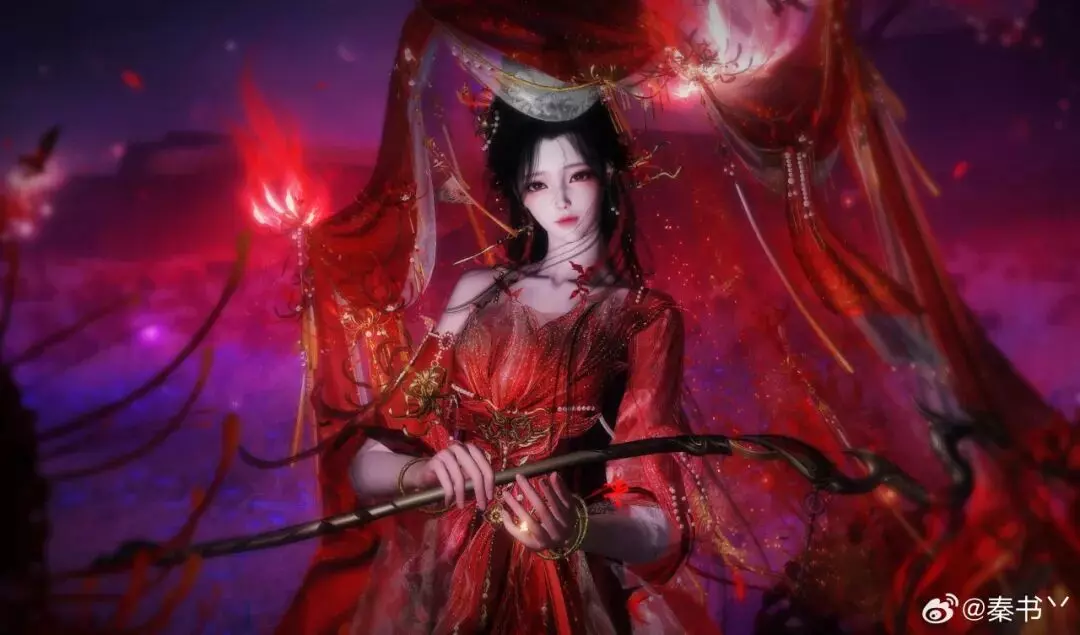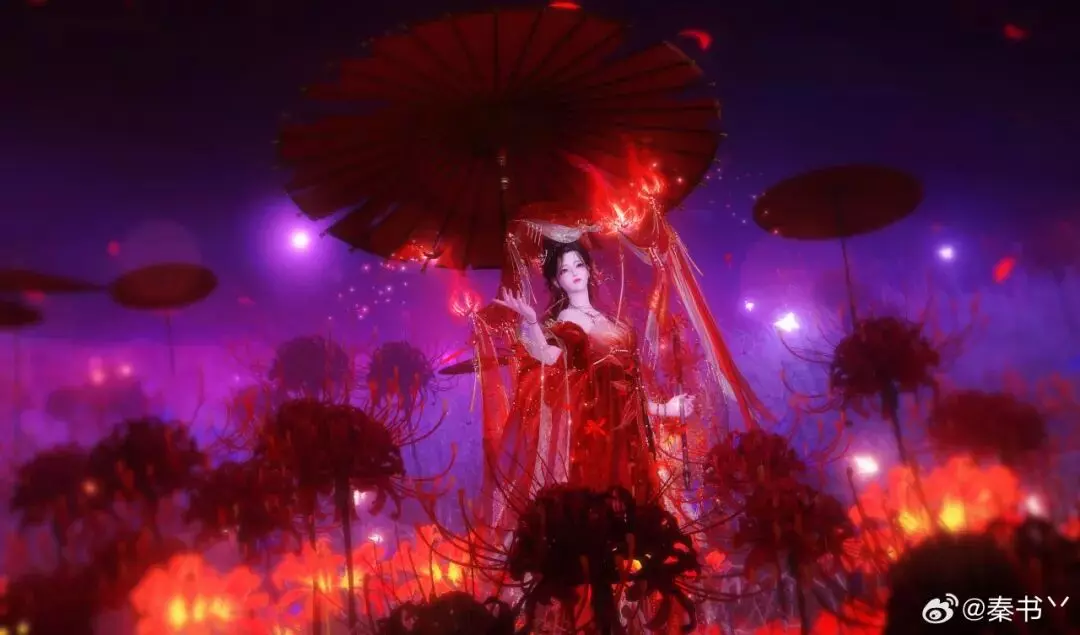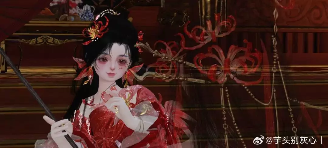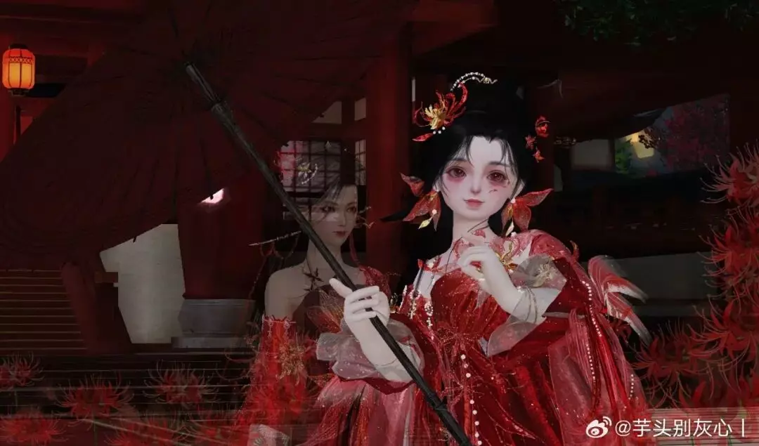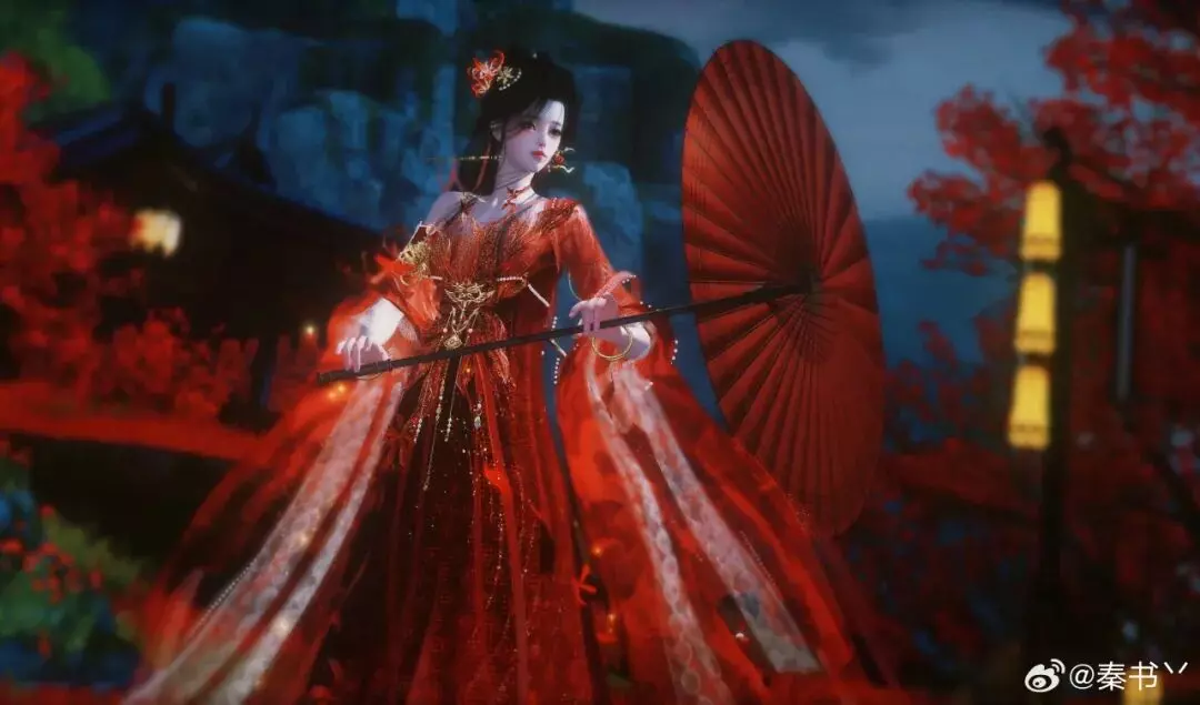 时装·情诉幽魂以赤红为主调,像把盛放的彼岸花穿在了身上。轻纱层层铺开,裙摆随动作曳出流光,腰挂·照骨观身动作的纸伞、花影、飘带色彩彼此呼应,更有故事感,仿佛一转身,就能惊起满地花火。