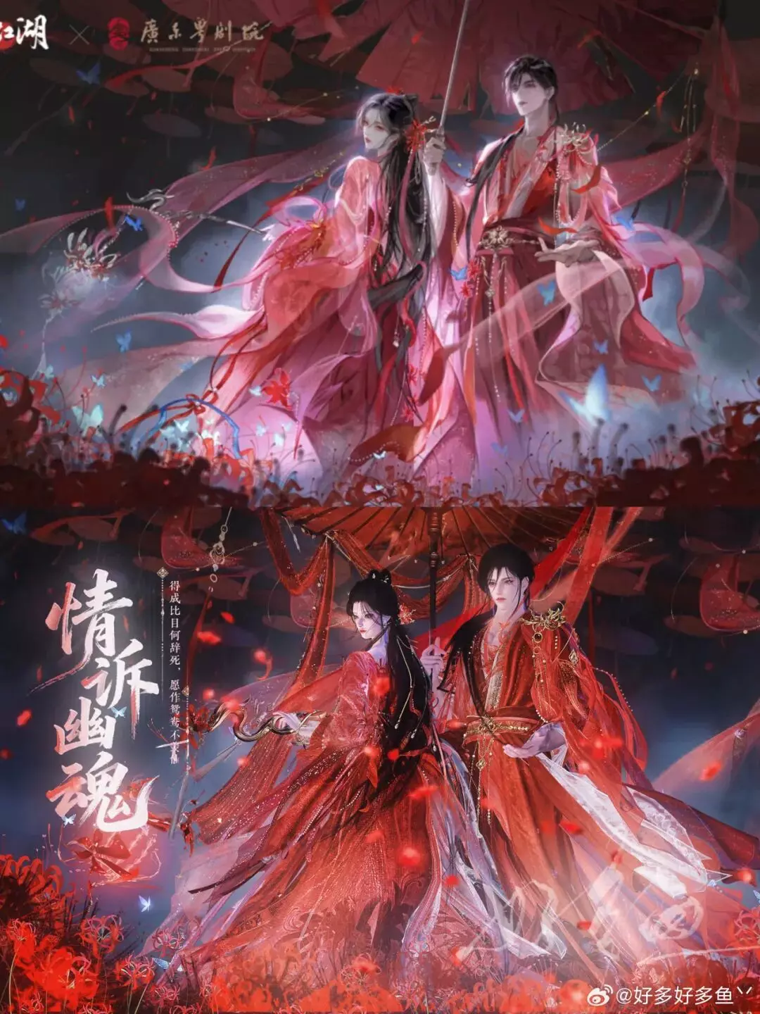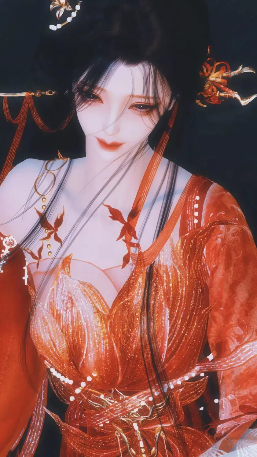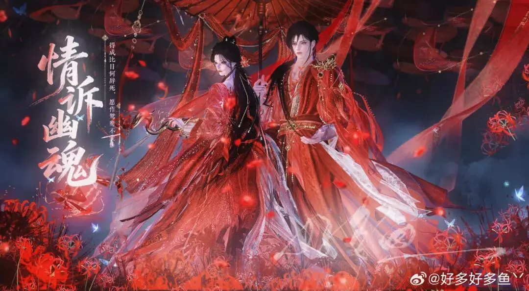 时装·情诉幽魂以浓烈的红为主色,衣袂轻软,纹饰精巧,发间金饰与耳畔流苏相互映衬,把人物衬得既娇艳又灵动。画面里那一道若隐若现的虚影,像是旧梦未散,又像是与未来之人相遇。