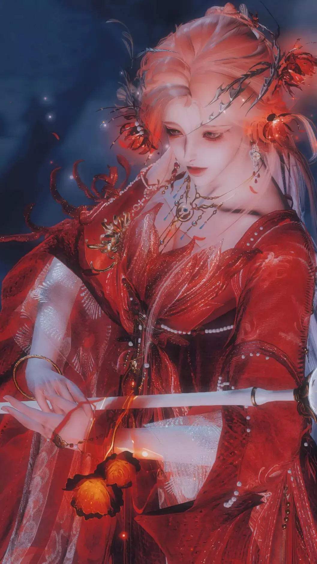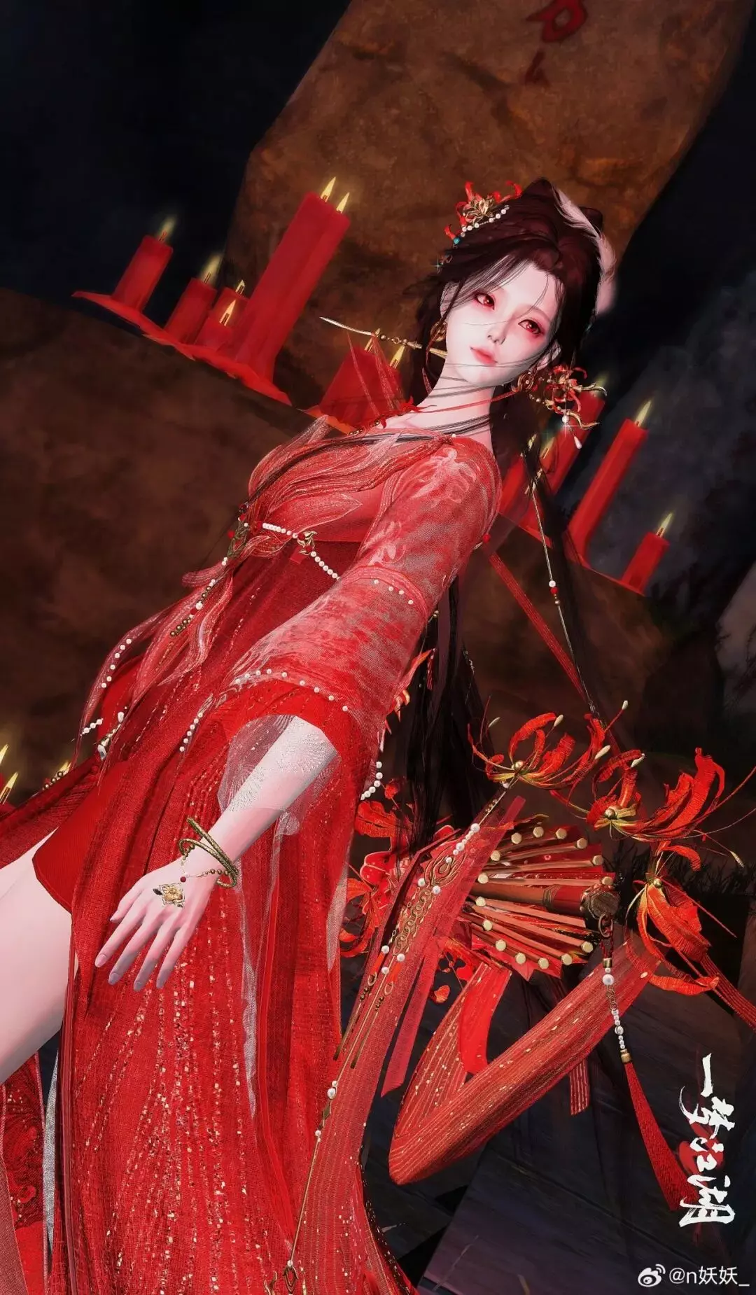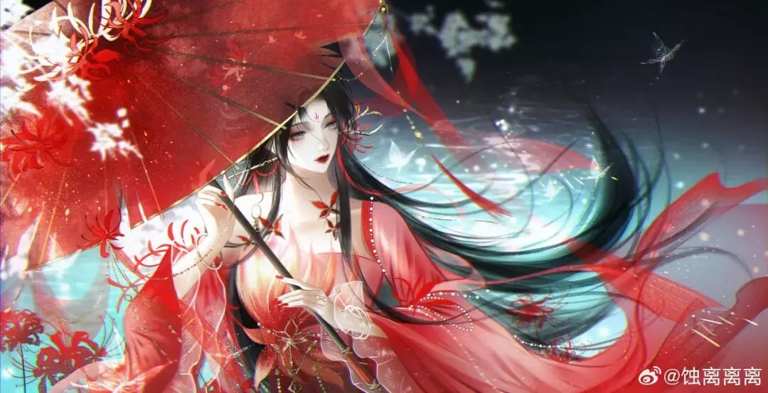 身穿时装·情诉幽魂站在夜幕下,黑发如夜,红衣似火,兼具古典与优雅,又带着几分凌厉的张扬,仿佛把龙爪花的柔美与黑夜的锋芒同时穿在了身上。
