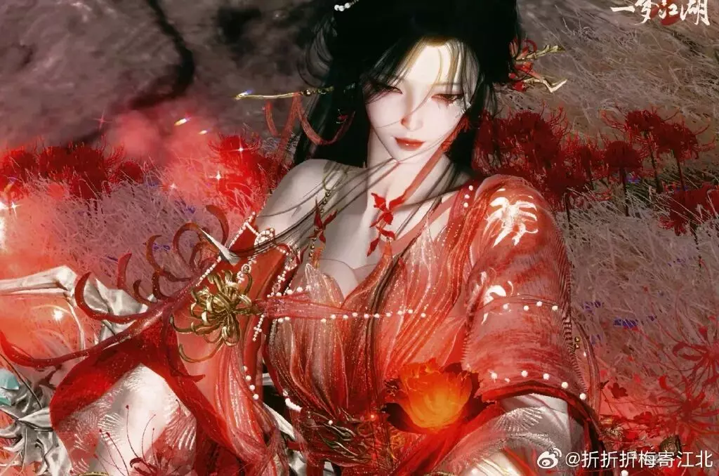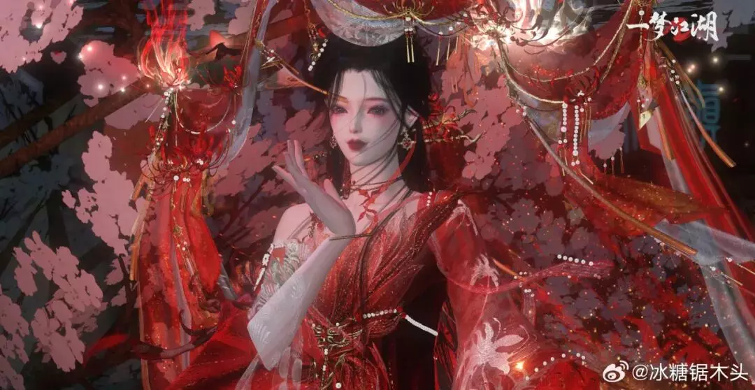 赤色,是聂小倩热烈的风骨。情至深处,烧穿云河山峦;时装·情诉幽魂便取意于这般炽烈,风过处,龙爪花曳着头饰·胭纱窥情的红纱翩跹,为少侠裁一身惊鸿模样。