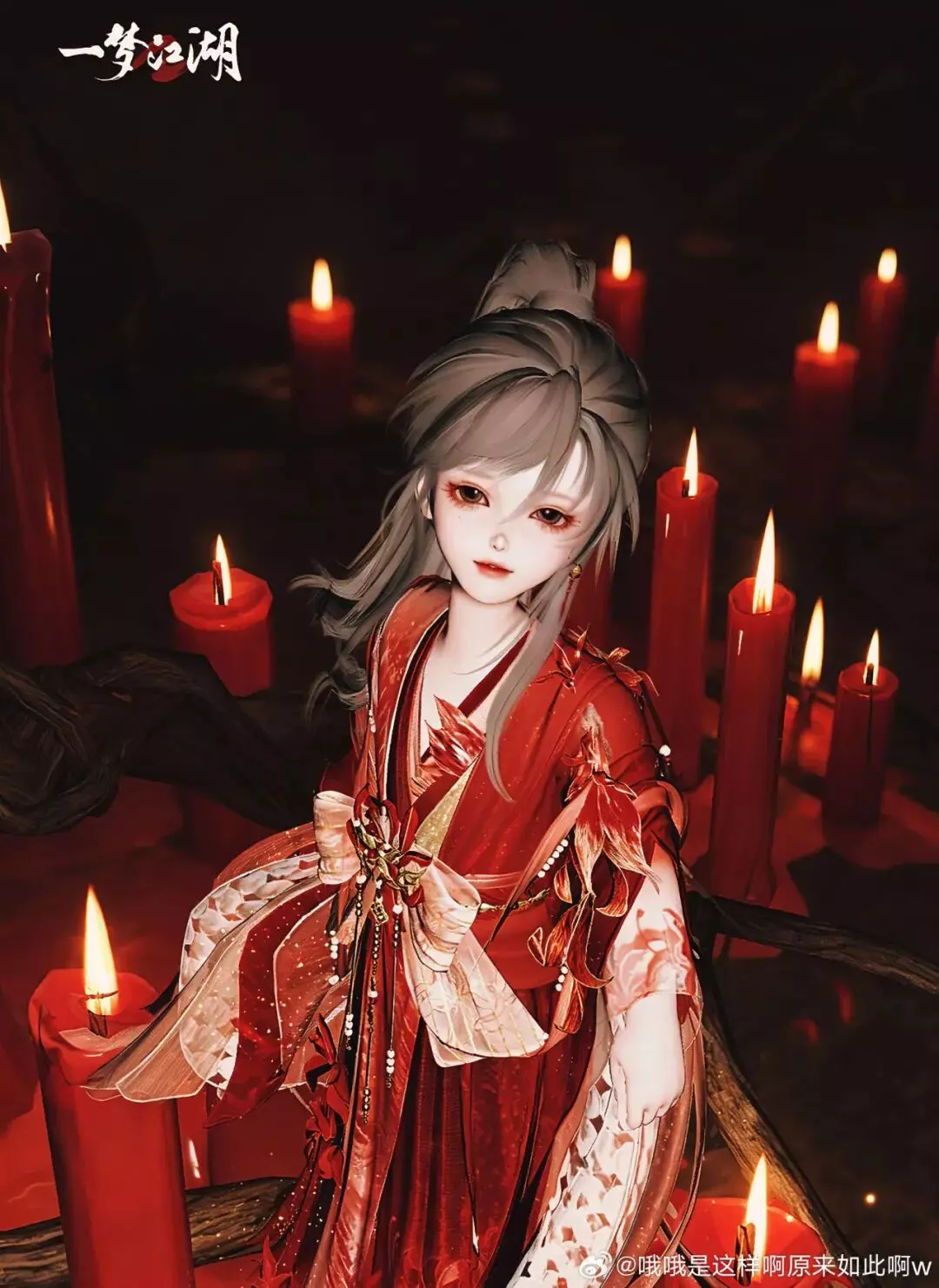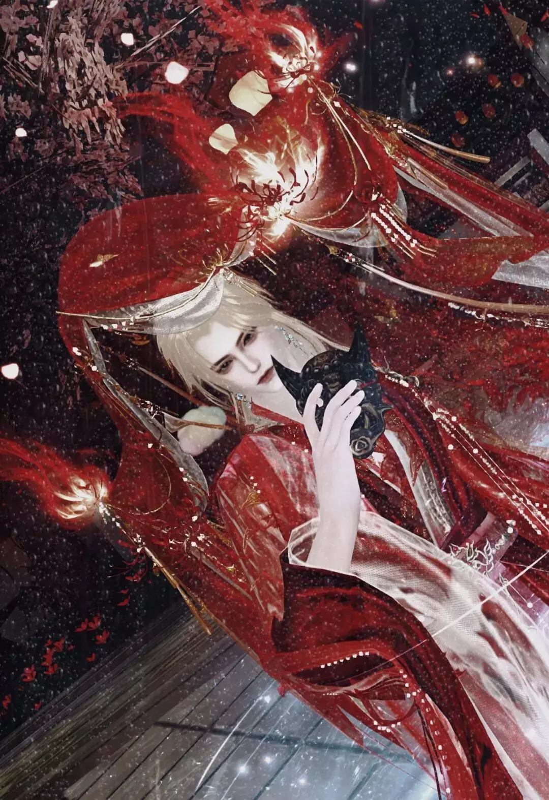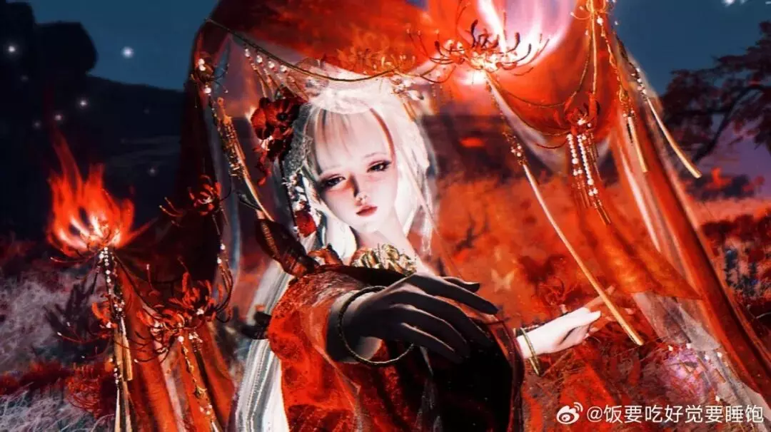 少侠的单人摄影依旧氛围感十足!时装·情诉幽魂与头饰·胭纱窥情红衣如烬,千丝万缕的红丝带与龙爪花相互呼应,仿佛未竟的执念正在夜空里悄然抽芽。