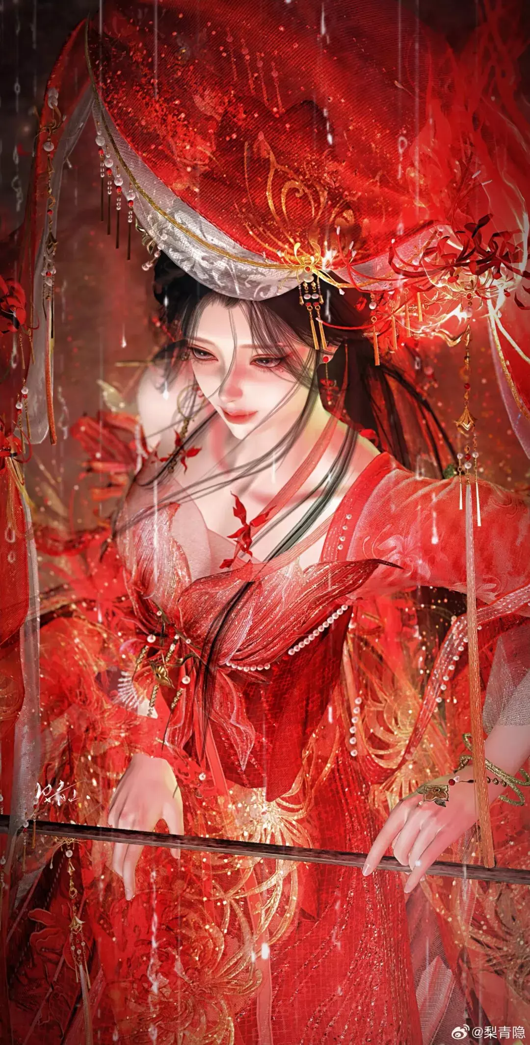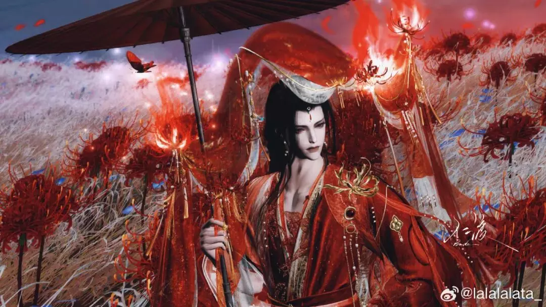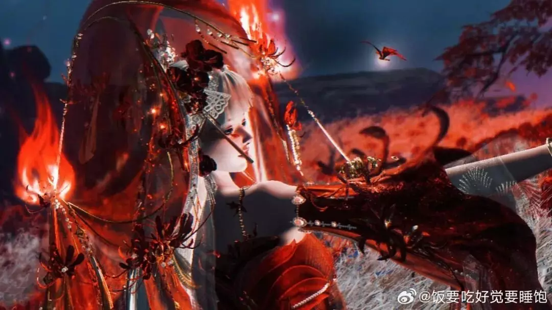 时装·情诉幽魂以浓烈的赤色为主调,大片红纱与金饰层层铺展,头饰·胭纱窥情的两团火光视觉冲击力极强,肩头的龙爪花装饰与周围花海彼此呼应!配上手中的纸伞,更添几分绮丽与仪式感。