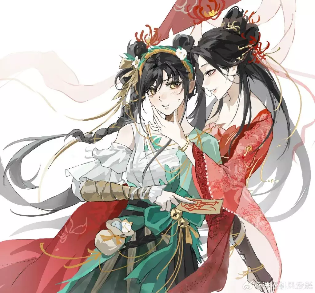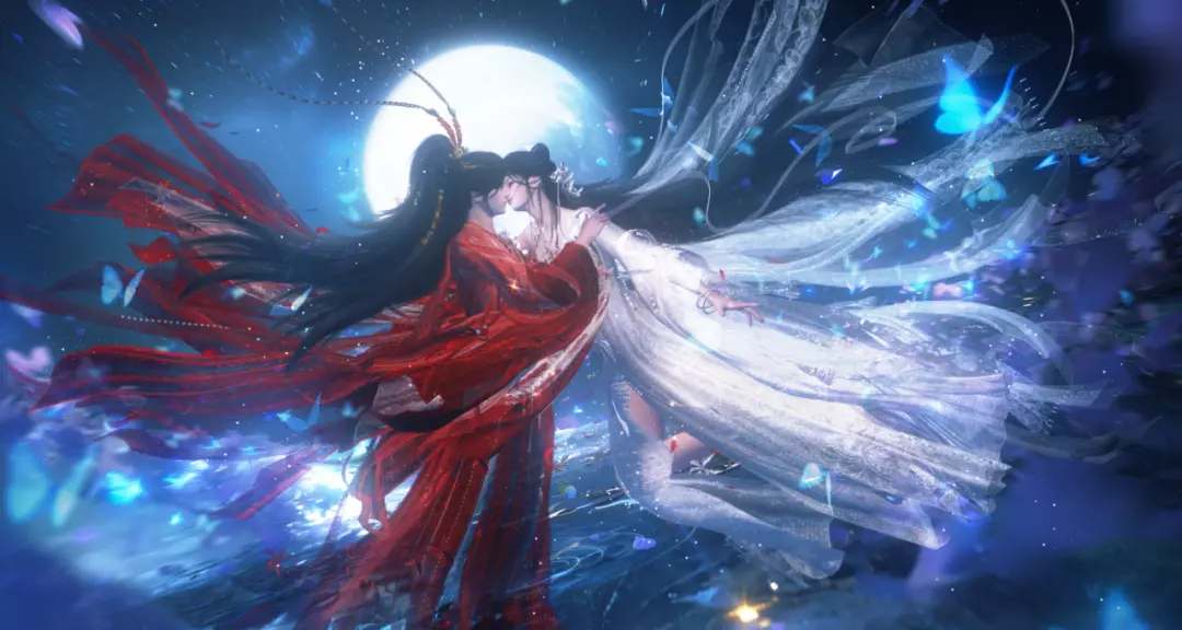夜幕垂落时,明月蘸满清辉,银纱覆于天地。裙摆翻飞仿佛两只蝴蝶舒展双翼,一袭红衫如烈焰吻过云绡,一袭素白若流萤栖于霜纱,此刻唯有彼此眼中星芒与月同辉,忘了朝暮,不问浮生。